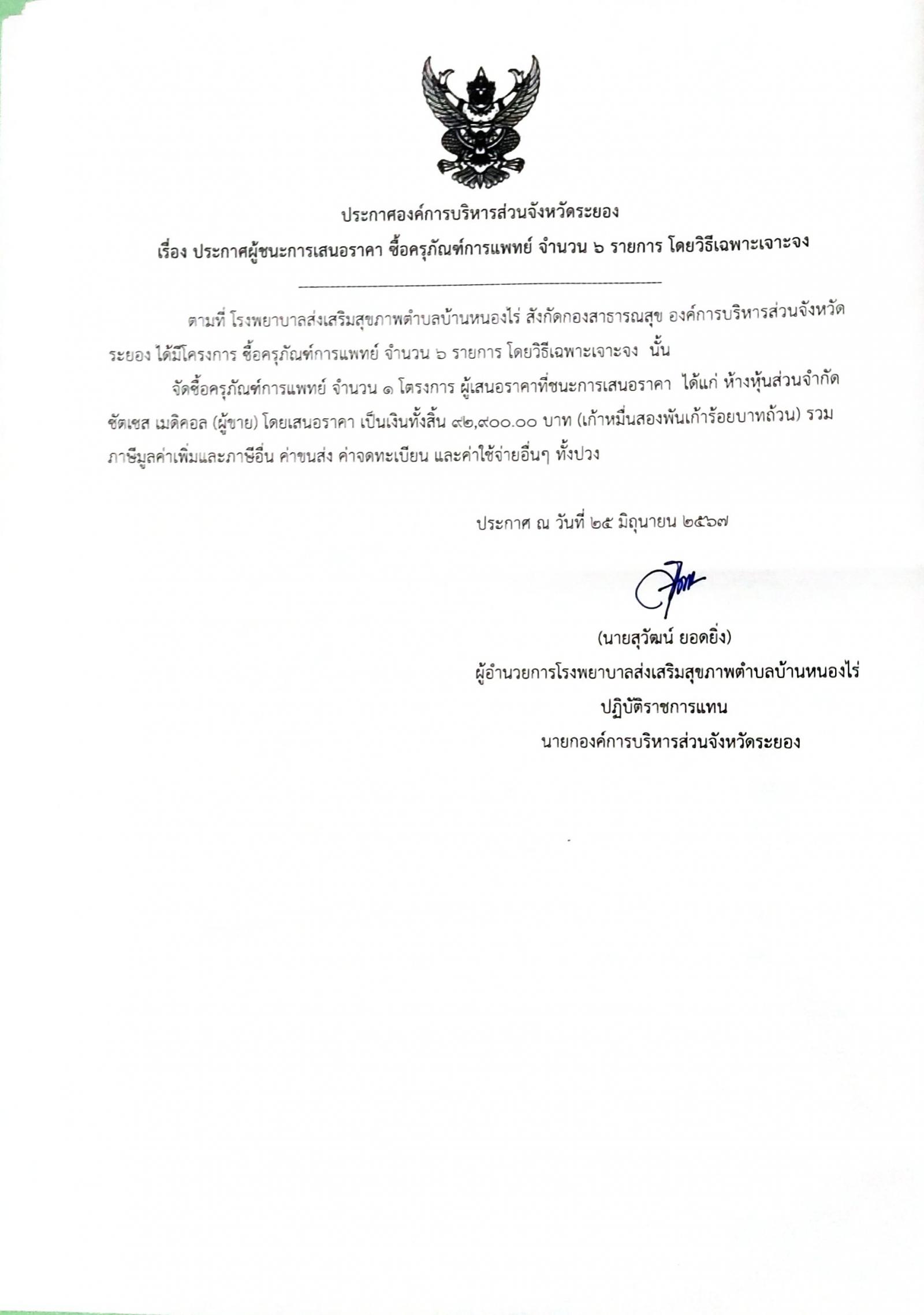 ประกาศผู้ชนะการเสนอราตา ซื้อครุภัณฑ์การแพทย์ จำนวน 6 รายการ โดยวิธีเฉพาะเจาะจง