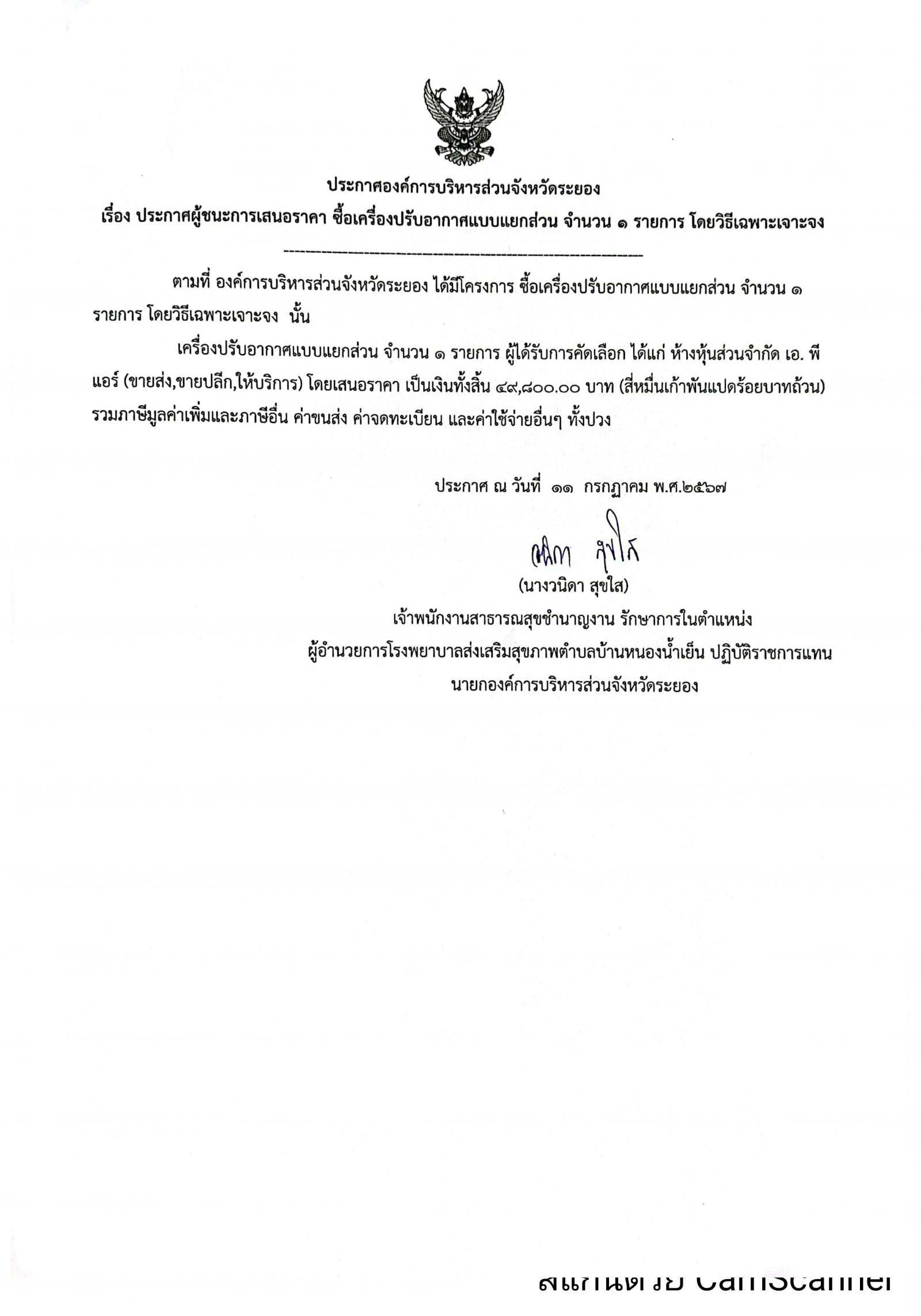 ประกาศผู้ชนะการเสนอราคา ซื้อเครื่องปรับอากาศแบบแยกส่วน จำนวน 1 รายการ โดยวิธีเฉพาะเจาะจง