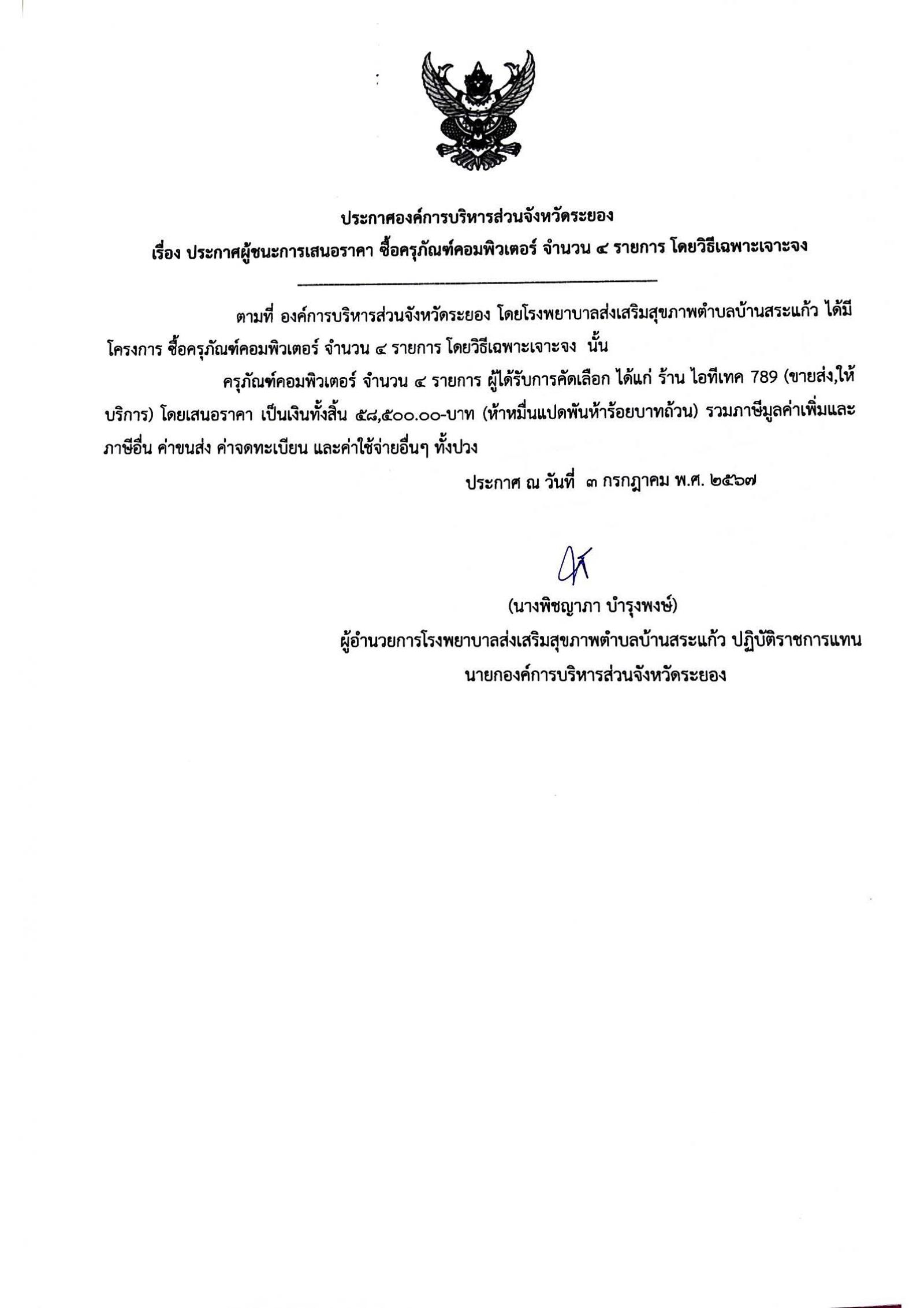 ประกาศผู้ชนะการเสนอราคา ซื้อครุภัณฑ์คอมพิวเตอร์ จำนวน 3 รายการ โดยวิธีเฉพาะเจาะจง