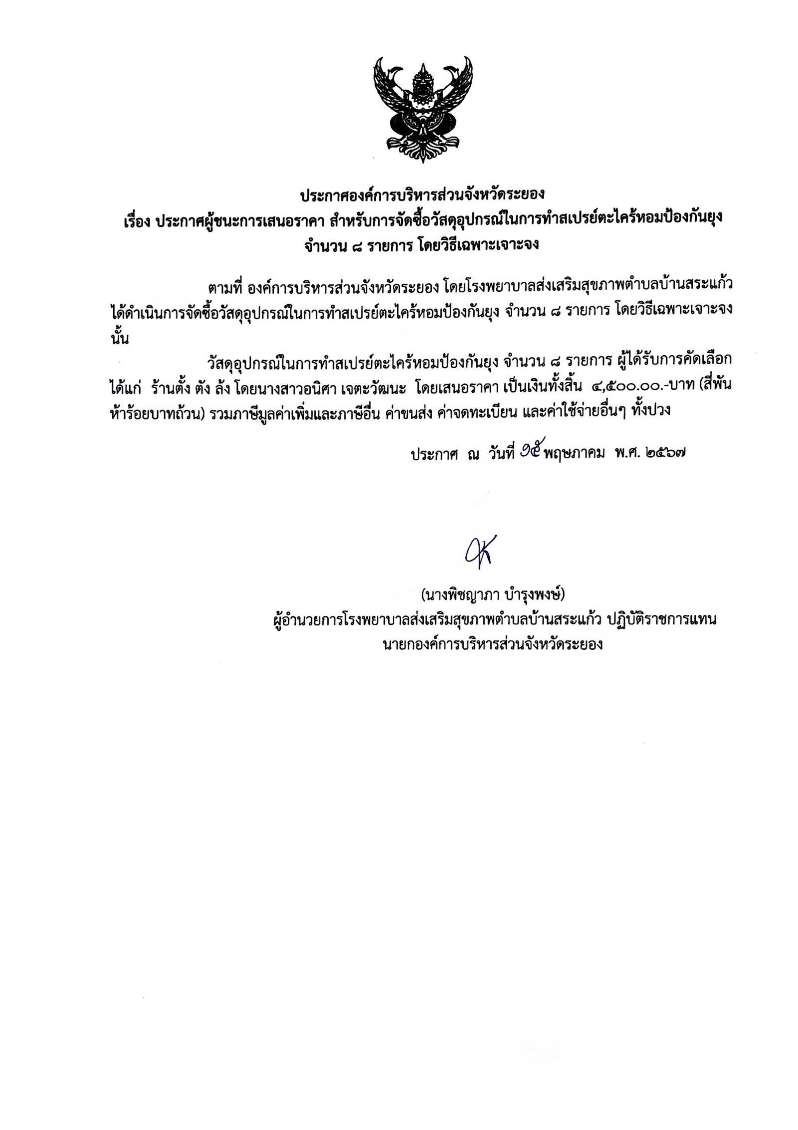 ประกาศผู้ชนะการเสนอราคา สำหรับการจัดซื้อวัสดุอุปกรณ์ในการทำสปรย์ตะไคร้หอมป้องกันยุง จำนวน 8 รายการ โดยวิธีเฉพาะเจาะจง