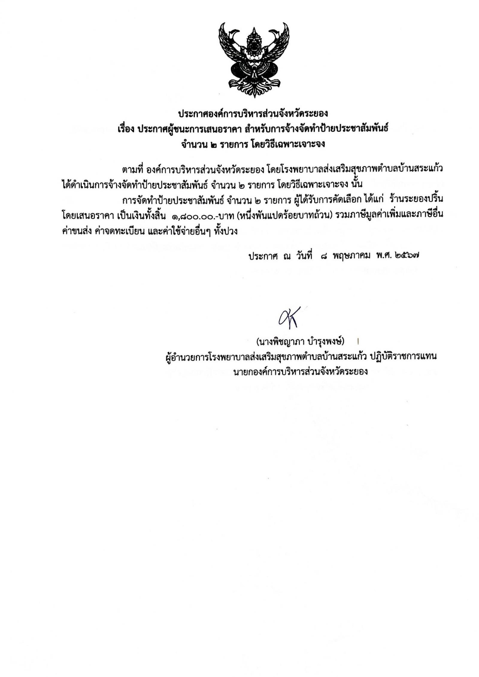 ประกาศผู้ชนะการเสนอราคา สำหรับการจ้างจัดทำป้ายประชาสัมพันธ์ จำนวน 2 รายการ โดยวิธีเฉพาะเจาะจง
