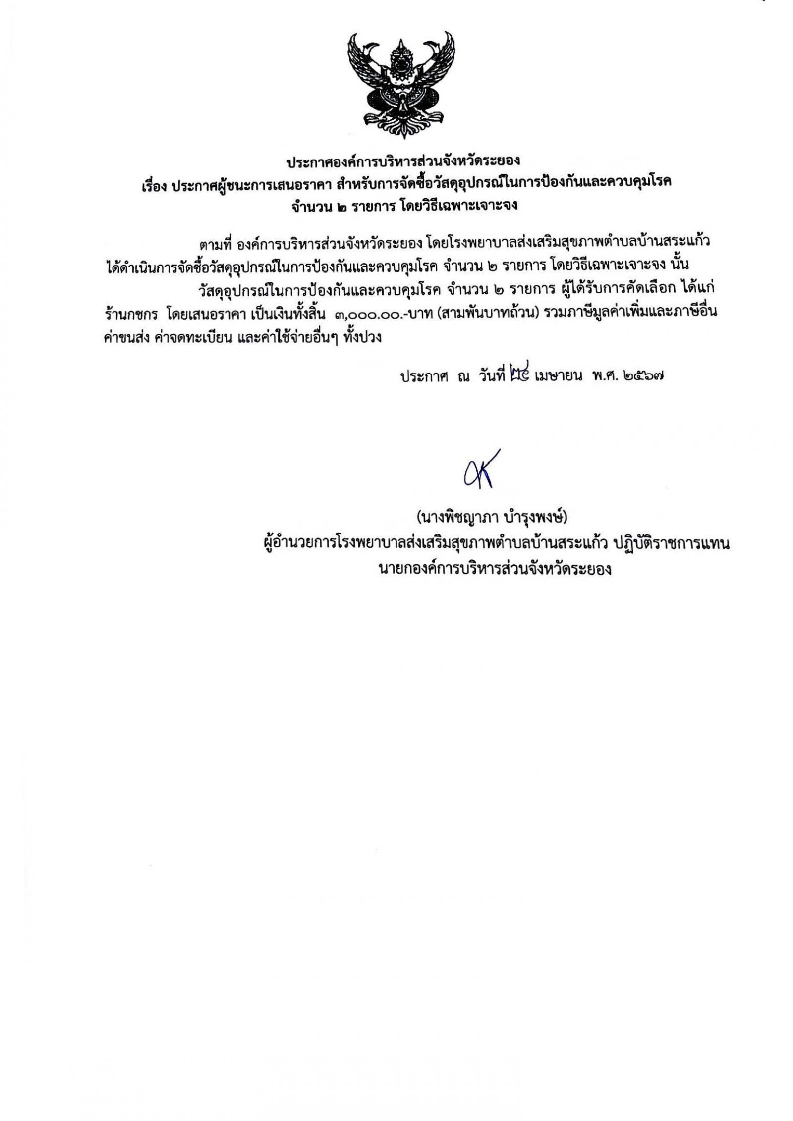 ประกาศผู้ชนะการเสนอราคา สำหรับการจัดซื้อวัสดุอุปกรณ์ในการป้องกันและควบคุมโรค จำนวน 2 รายการ โดยวิธีเฉพาะเจาะจง