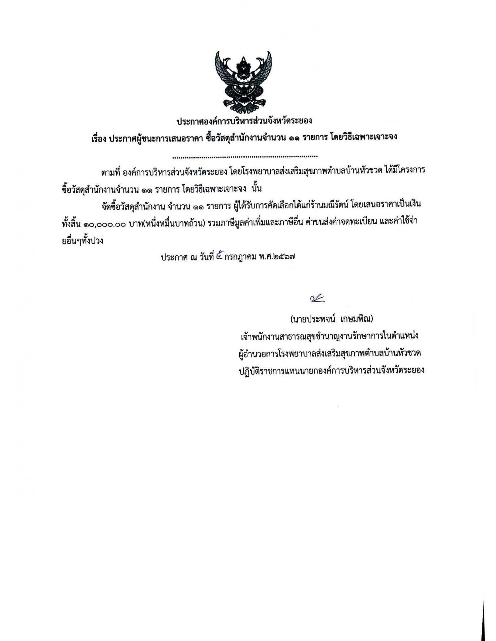 ประกาศผู้ชนะการเสนอราคา ซื้อวัสดุสำนักงานจำนวน 11 รายการ โดยวิธีเฉพาะเจาะจง