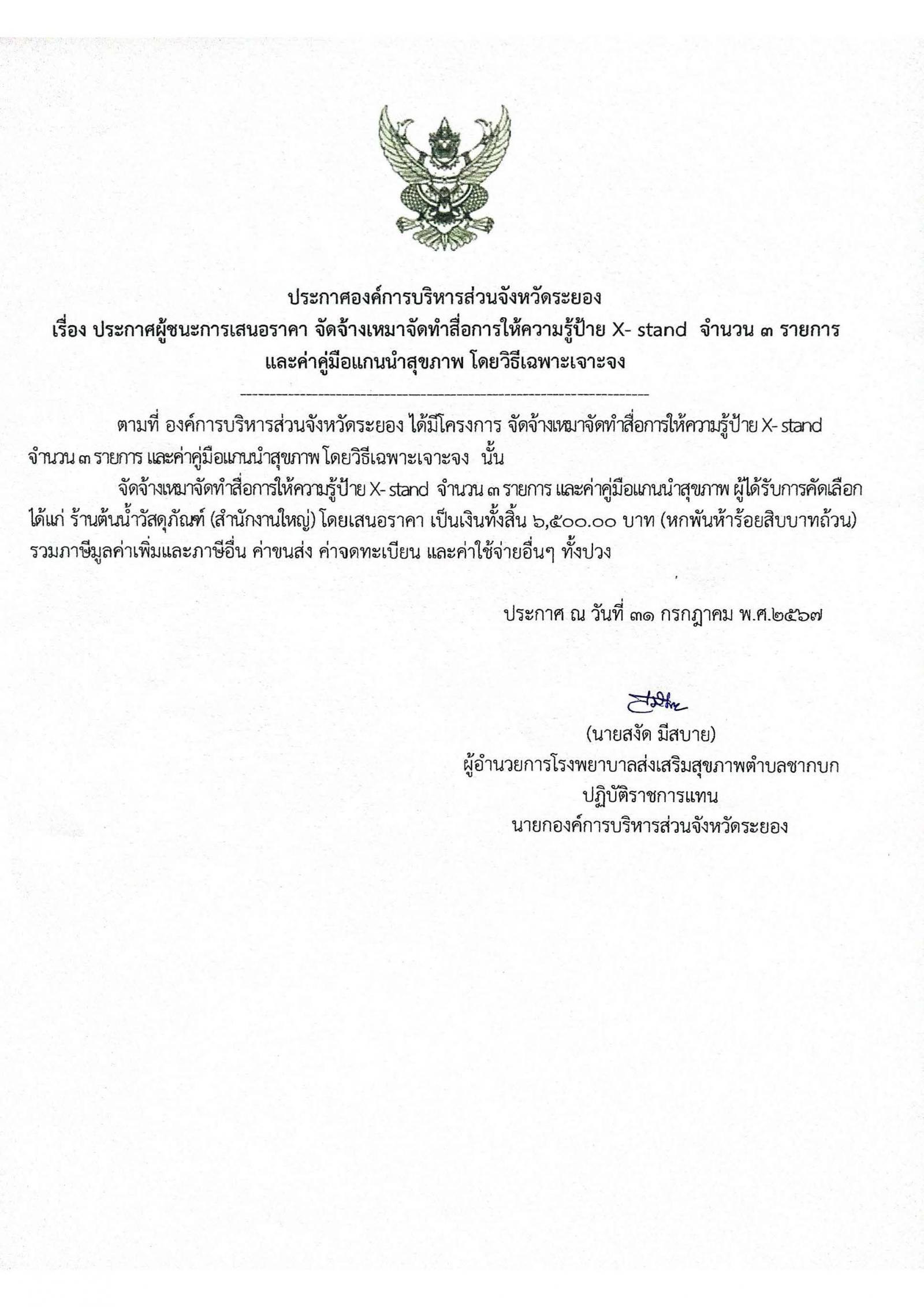 ประกาศผู้ชนะการเสนอราคา จัดจ้างเหมาจัดทำสื่อการให้ความรู้ป้าย X-stand จำนวน 3 รายการ และค่าคู่มือแกนนำสุขภาพ โดยวิธีเฉพาะเจาะจง