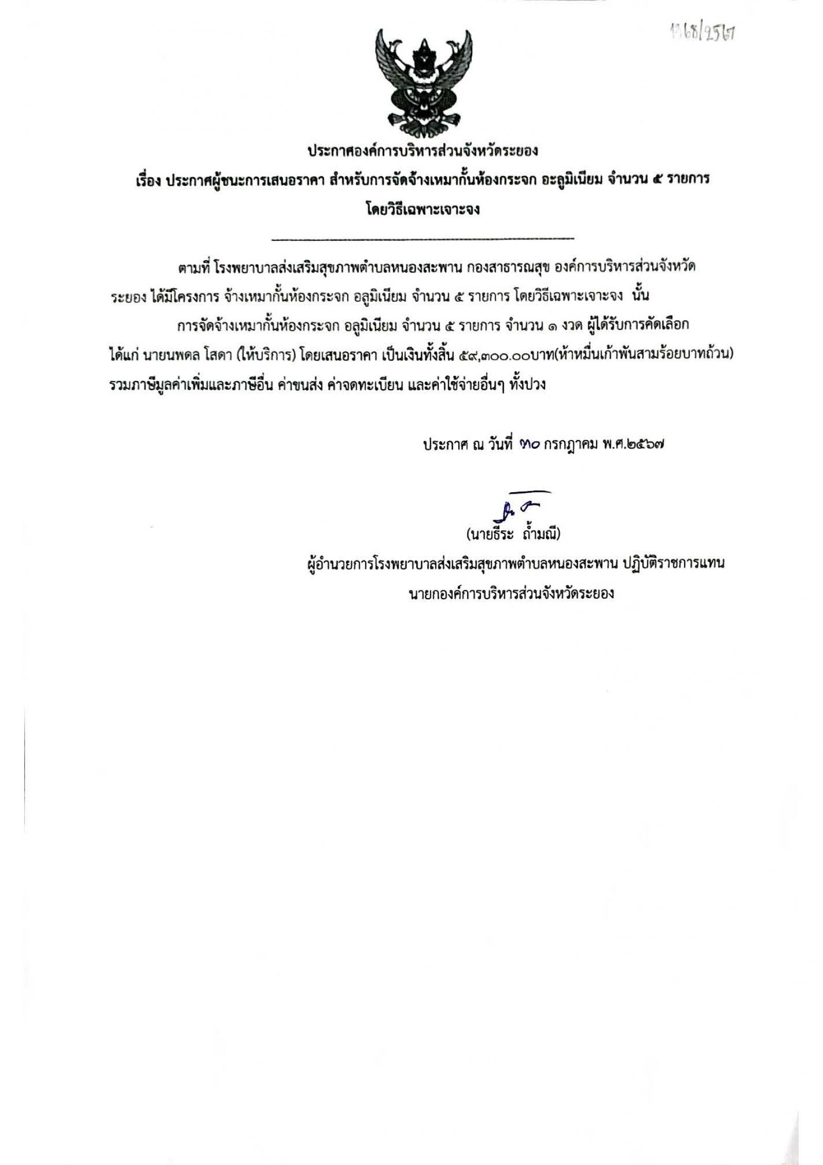 ประกาศผู้ชนะการเสนอราคา สำหรับการจัดจ้างเหมากั๊นห้องกระจก อะลูมิเนียม จำนวน 5 รายการ โดยวิธีเฉพาะเจาะจง
