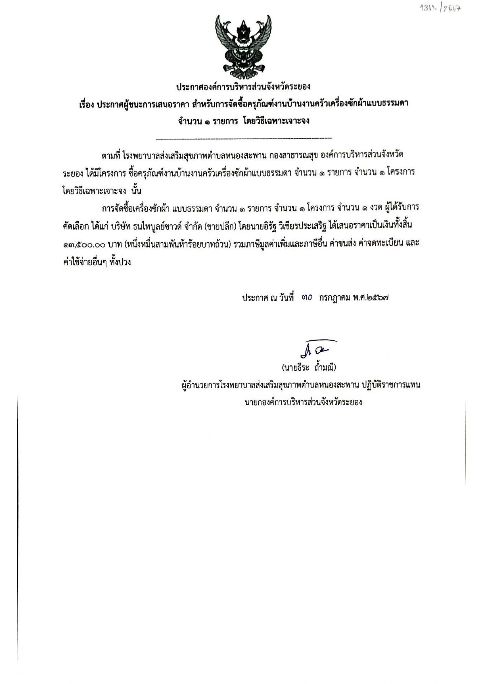 ประกาศผู้ชนะการเสนอราคา สำหรับการจัดซื้อครุภัณฑ์งานบ้านงานครัวเครื่องซักผ้าแบบธรรมดา จำนวน 1 รายการ โดยวิธีเฉพาะเจาะจง