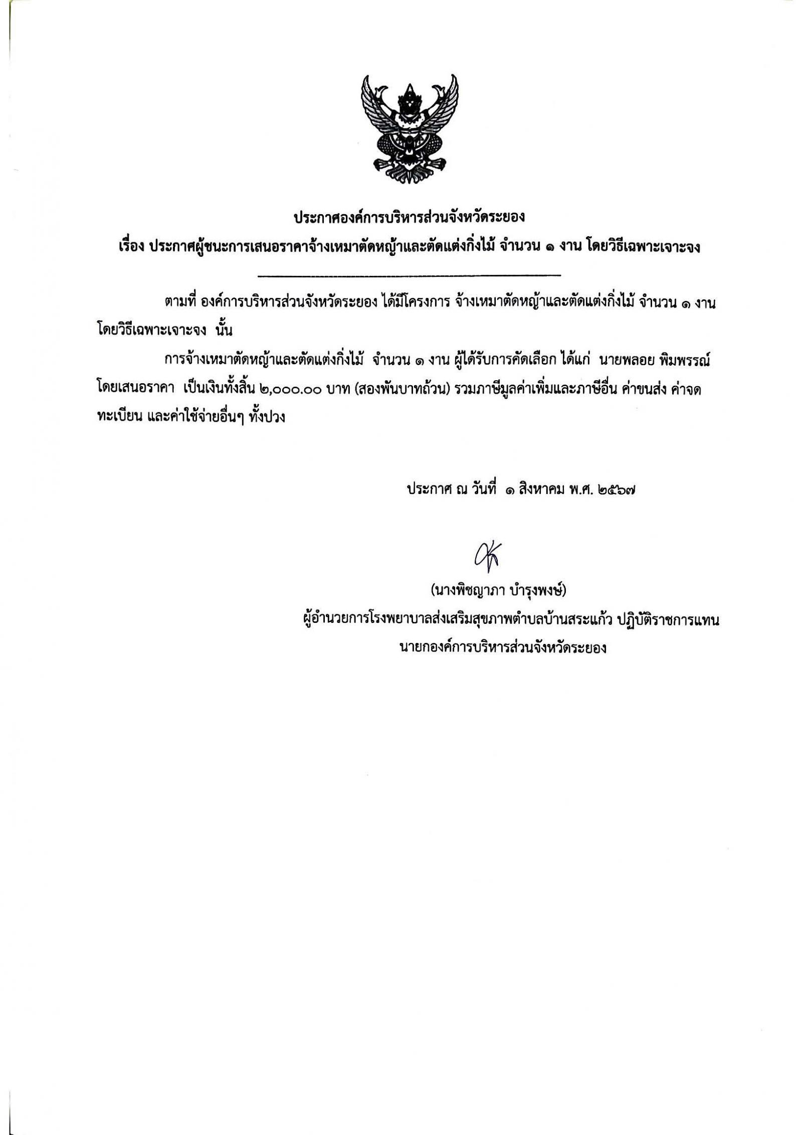 ประกาศผู้ชนะการเสนอราคาจ้างเหมาตัดหญ้าและตัดแต่งกิ่งไม้ จำนวน 1 งาน โดยวิธีเฉพาะเจาะจง