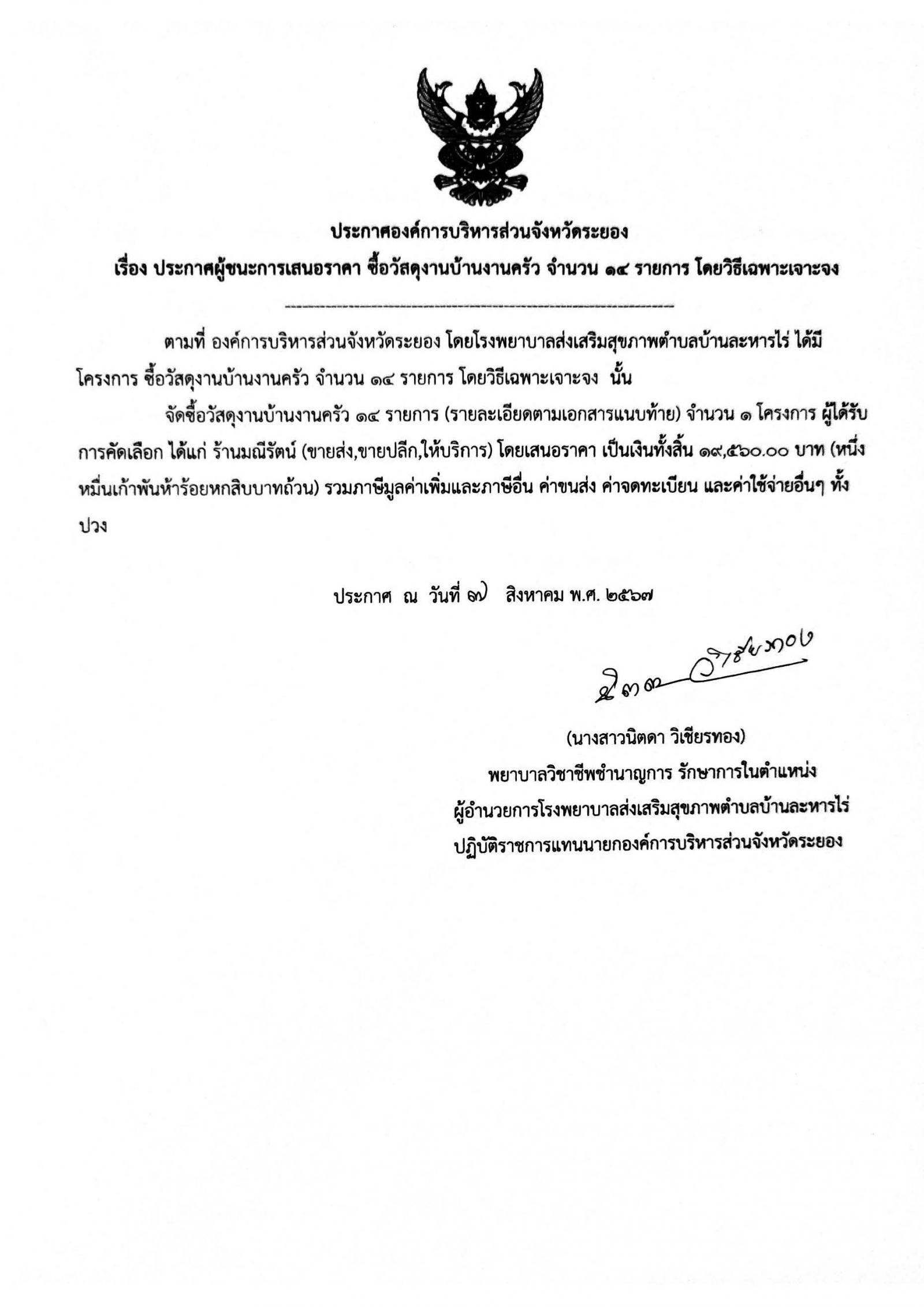 ประกาศผู้ชนะการเสนอราคา ซื้อวัสดุงานบ้านงานครัว จำนวน 14 รายการ โดยวิธีเฉพาะเจาะจง