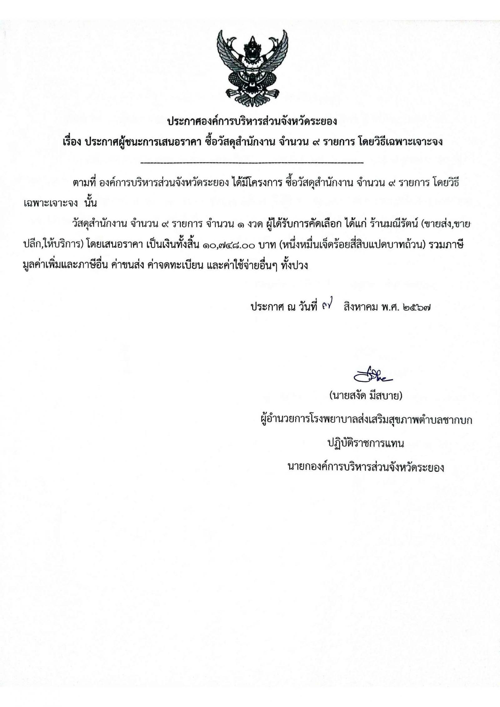 ประกาศผู้ชนะการเสนอราคา ซื้อวัสดุสำนักงาน จำนวน 9 รายการ โดยวิธีเฉพาะเจาะจง