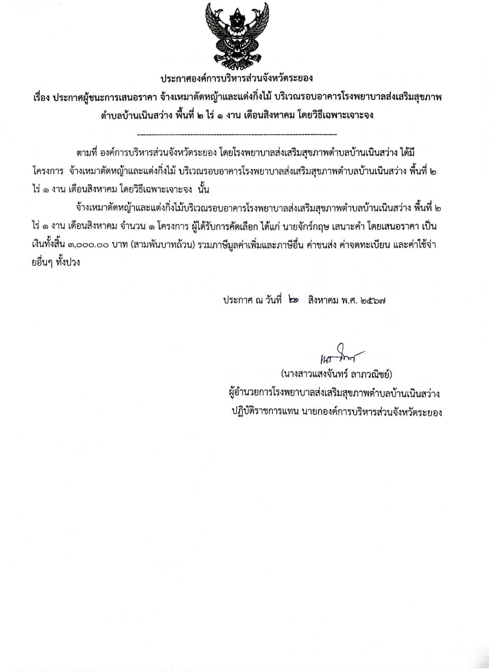 ประกาศผู้ชนะการเสนอราคา จ้างเหมาตัดหญ้าและแต่งกิ่งไม้ บริเวณรอบอาคาร รพ.สต.บ้านเนินสว่าง พื้นที่ 2 ไร่ 1 งาน เดือนสิงหาคม โดยวิธีเฉพาะเจาะจง