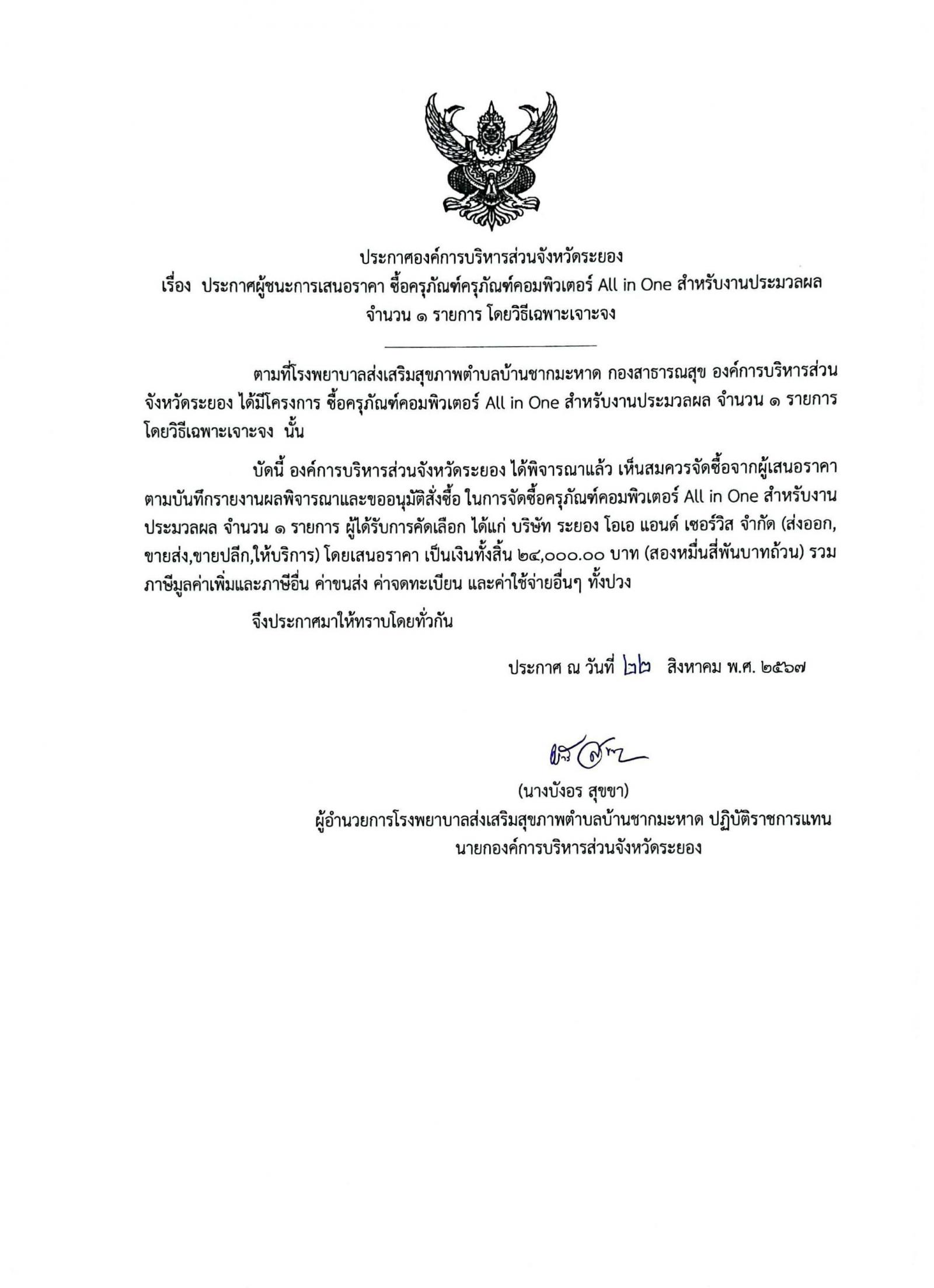 ประกาศผู้ชนะการเสนอราคา ซื้อครุภัณฑ์คอมพิวเตอร์ All in one สำหรับงานประมวลผล จำนวน 1 รายการ โดยวิธีเฉพาะเจาะจง