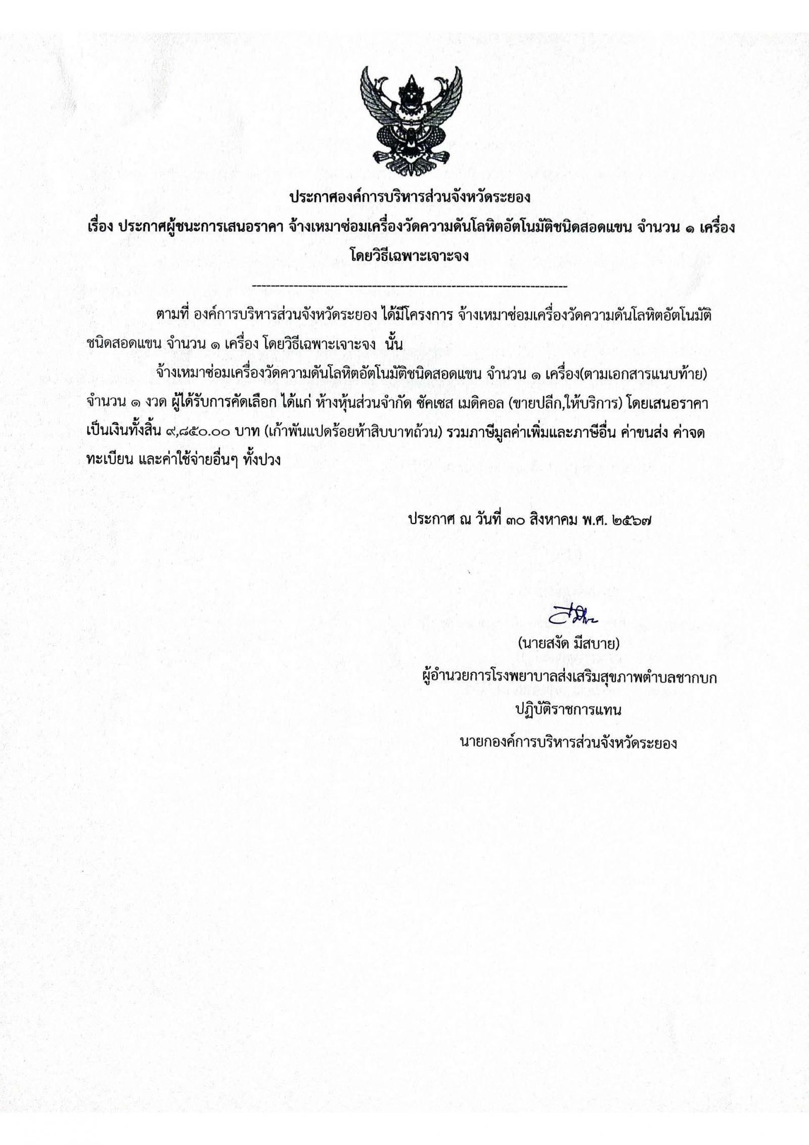ประกาศผู้ชนะการเสนอราคา จ้างเหมาซ่อมเครื่องวัดความดันโลหิตอัตโนมัตชนิดสอดแขน จำนวน 1 เครื่อง โดยวิธีเฉพาะเจาะจง