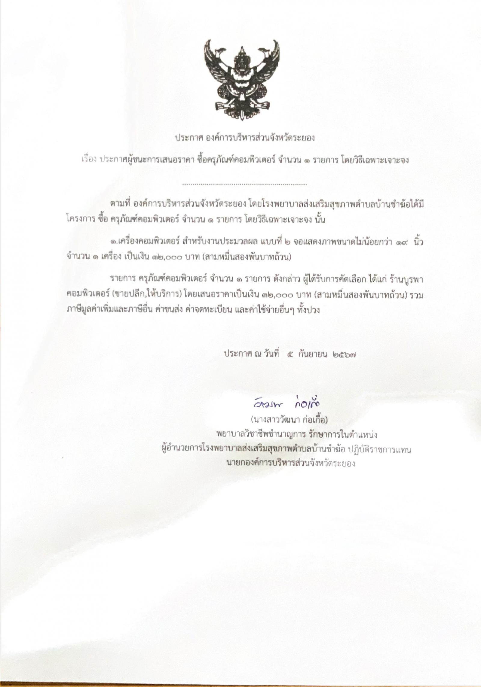 ประกาศผู้ชนะการเสนอราคา ซื้อครุภัณฑ์คอมพิวเตอร์ จำนวน 1 รายการ โดยวิธีเฉพาะเจาะจง