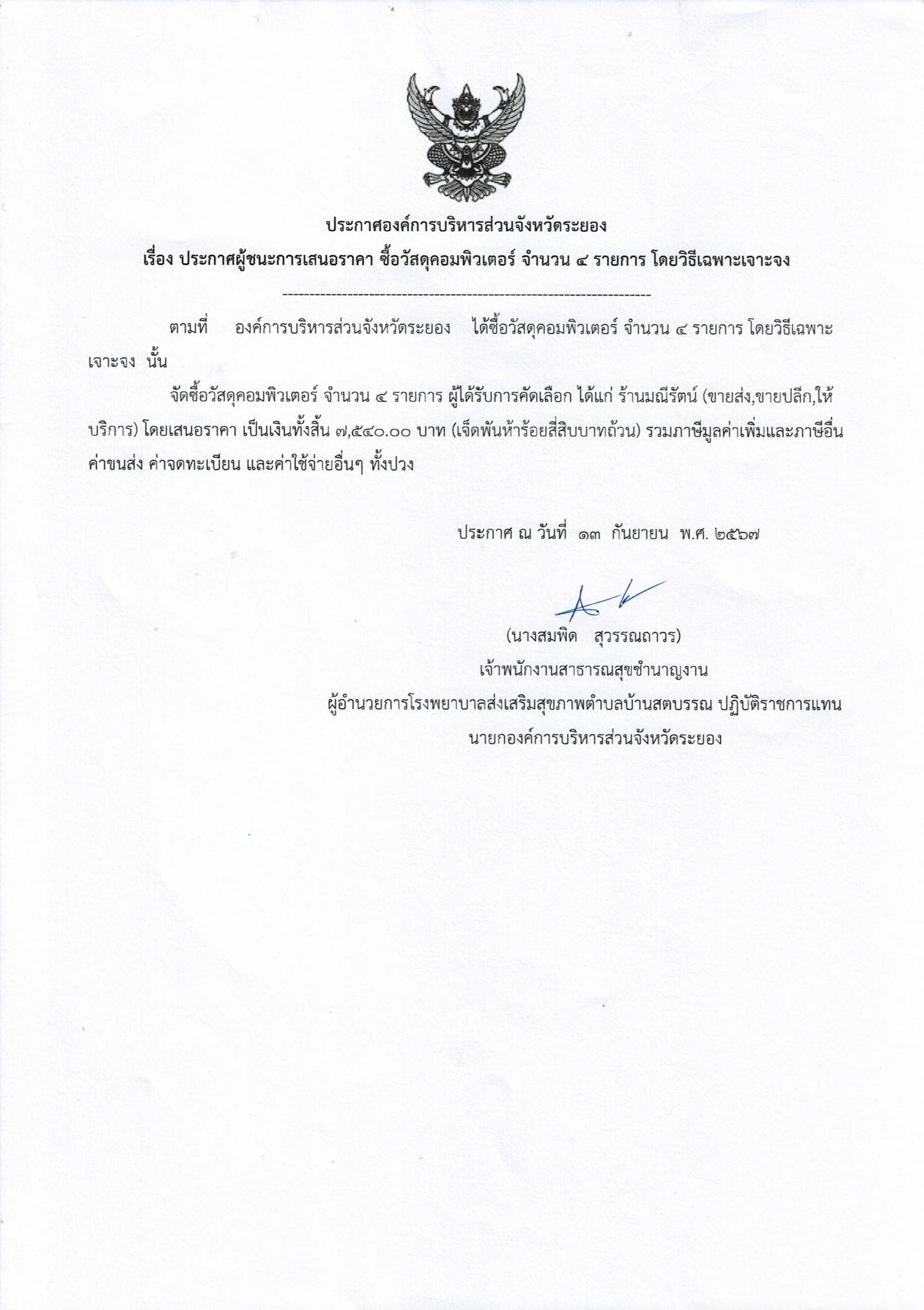 ประกาศผู้ชนะการเสนอราคา ซื้อวัสดุคอมพิวเตอร์ จำนวน 4 รายการ โดยวิธีเฉพาะเจาะจง