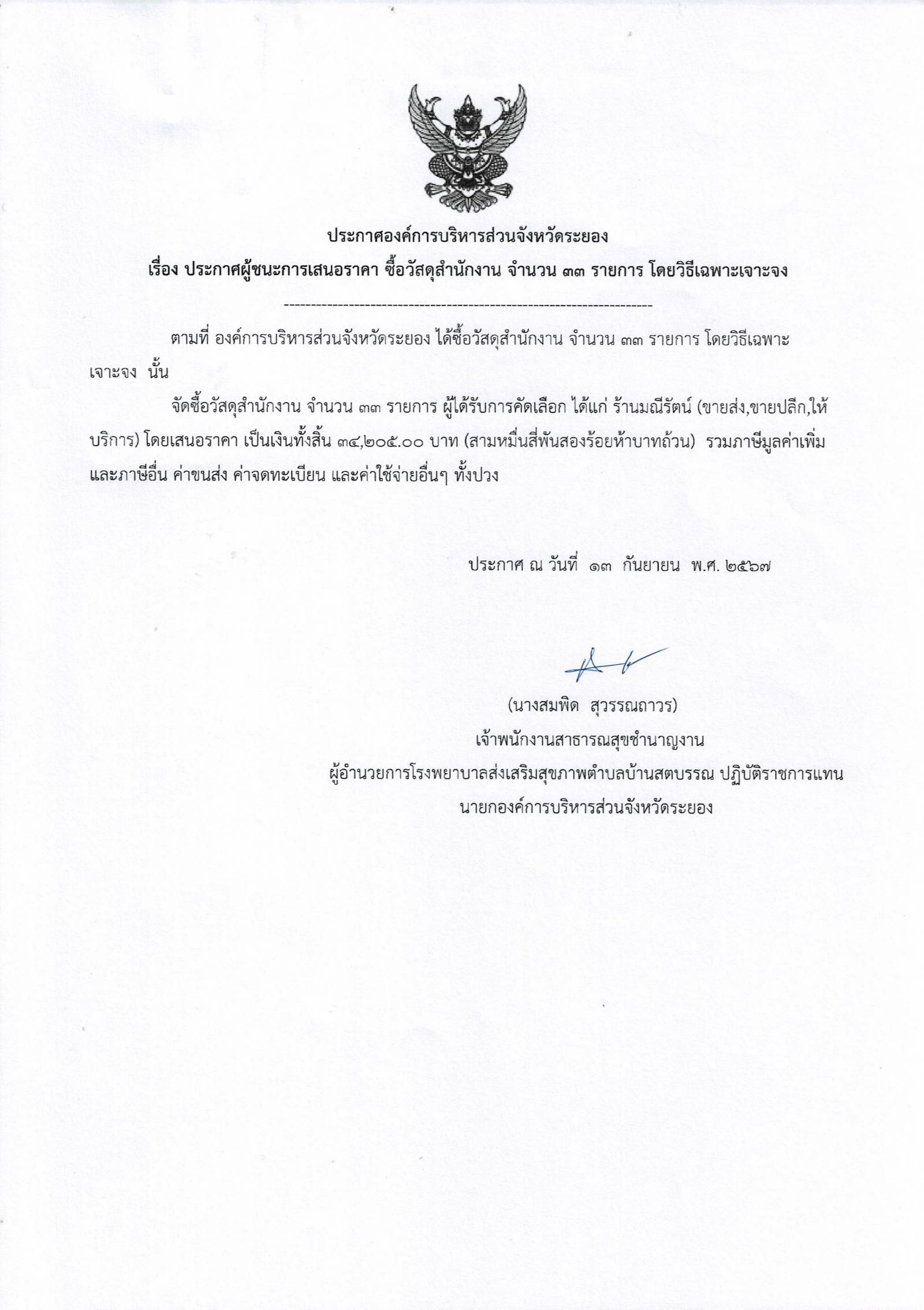 ประกาศผู้ชนะการเสนอราคา ซื้อวัสดุสำนักงาน จำนวน 33 รายการ โดยวิธีเฉพาะเจาะจง