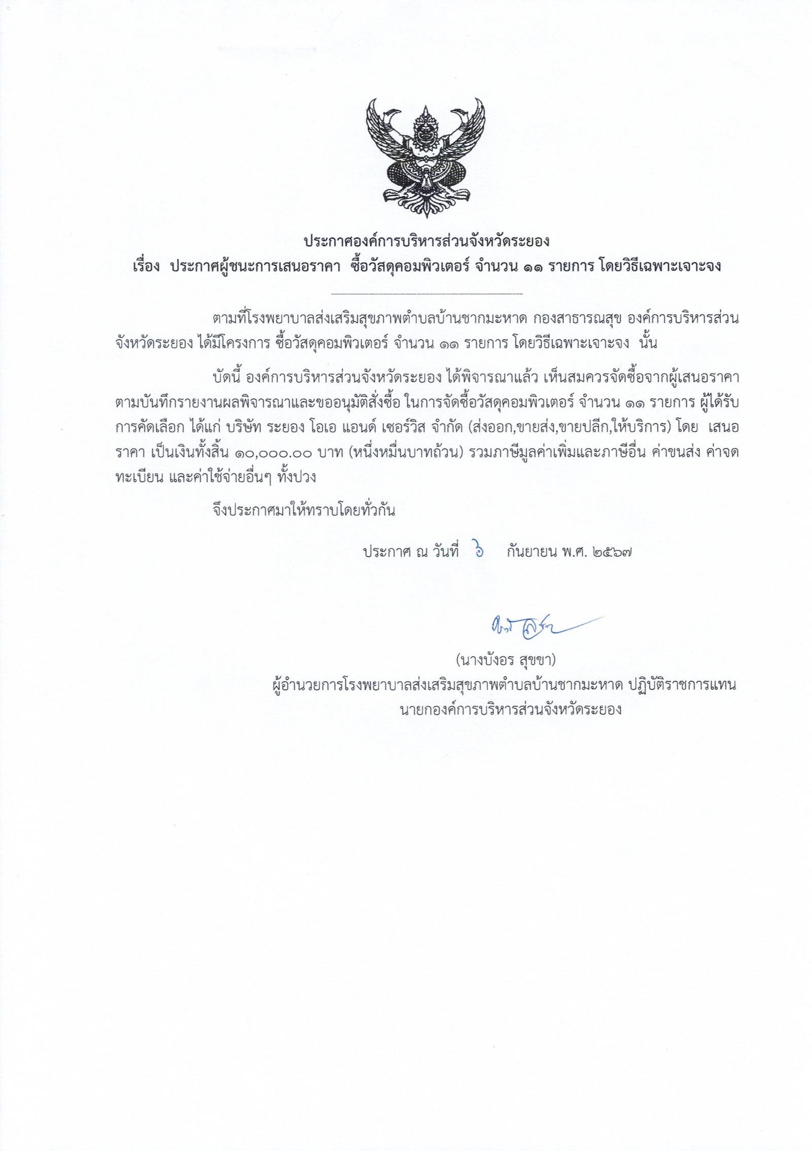 ประกาศผู้ชนะการเสนอราคา ซื้อวัสดุคอมพิวเตอร์ จำนวน 11 รายการ โดยวิธีเฉพาะเจาะจง