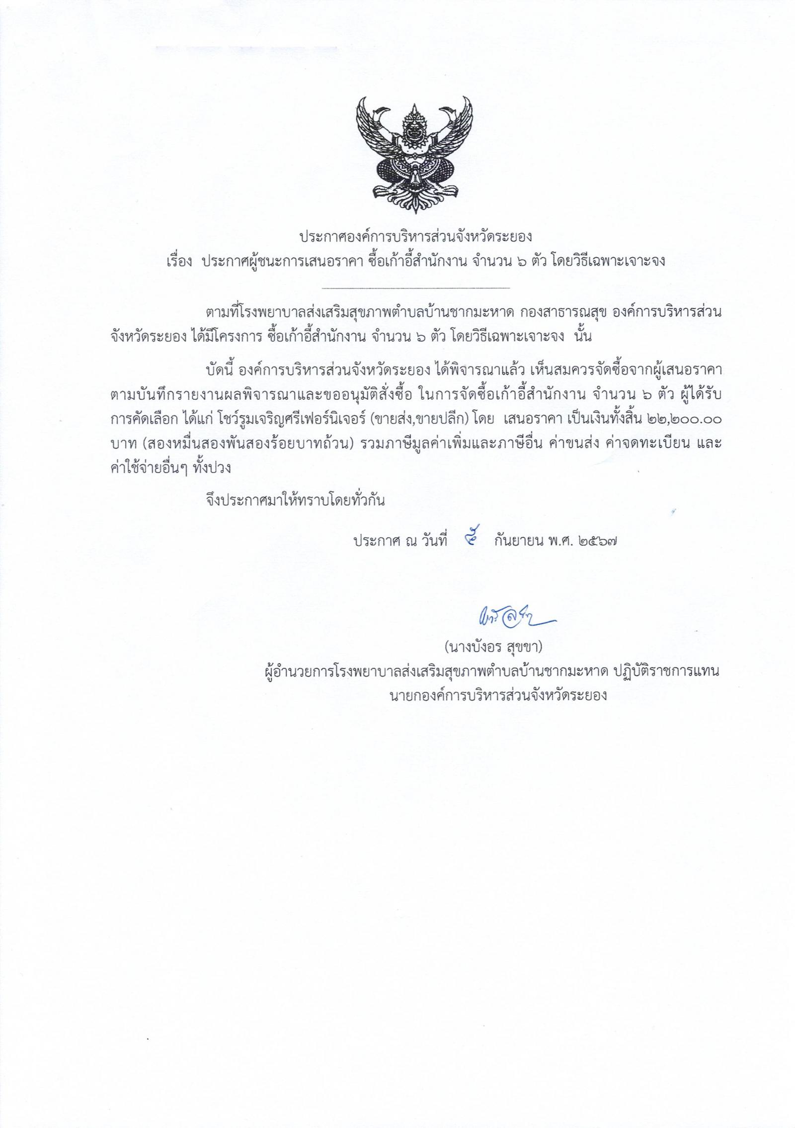 ประกาศผู้ชนะการเสนอราคา ซื้อเก้าอี้สำนักงาน จำนวน 6 ตัว โดยวิธีเฉพาะเจาะจง