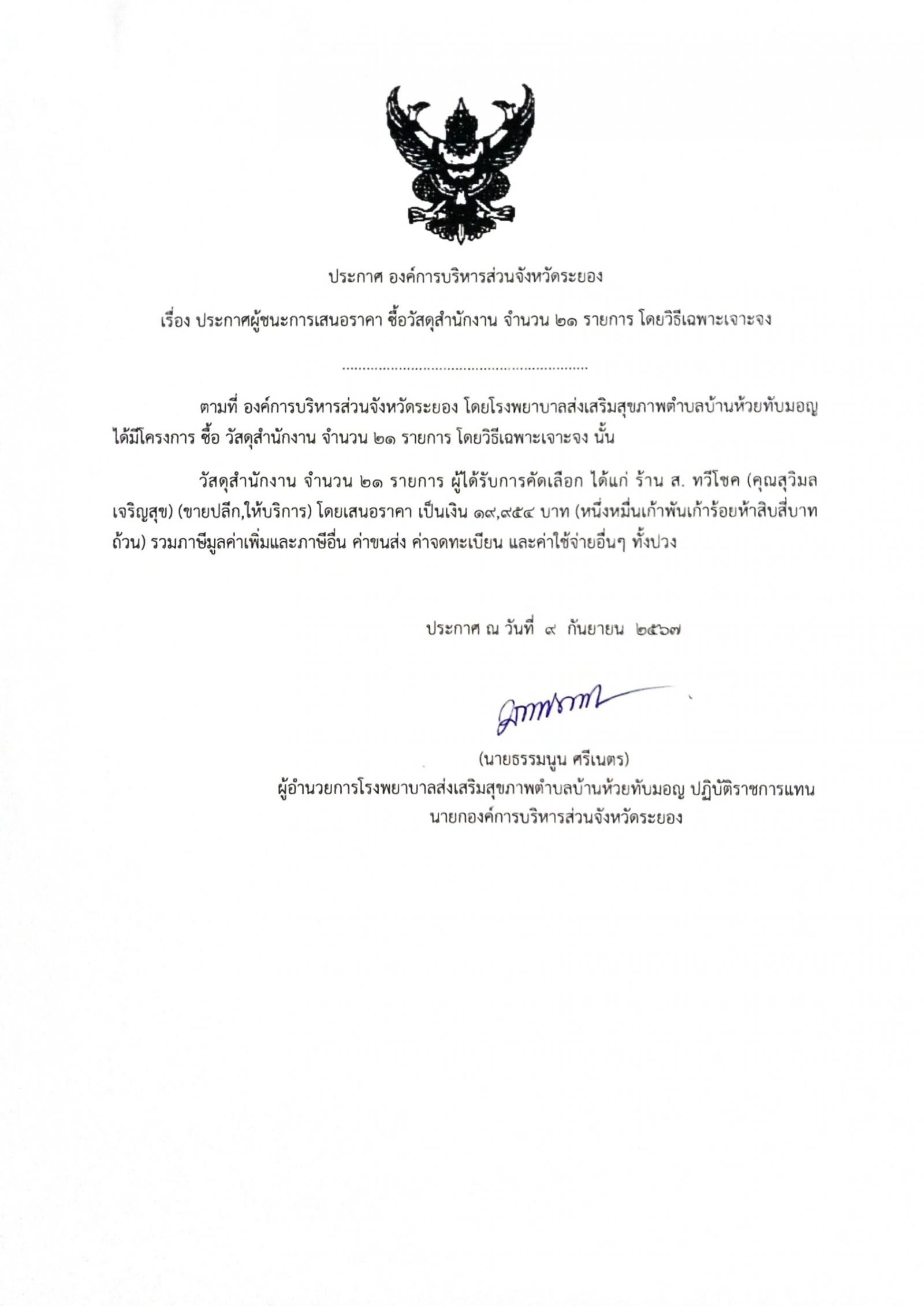ประกาศผู้ชนะการเสนอราคา ซื้อวัสดุสำนักงาน จำนวน 21 รายการ โดยวิธีเฉพาะเจาะจง