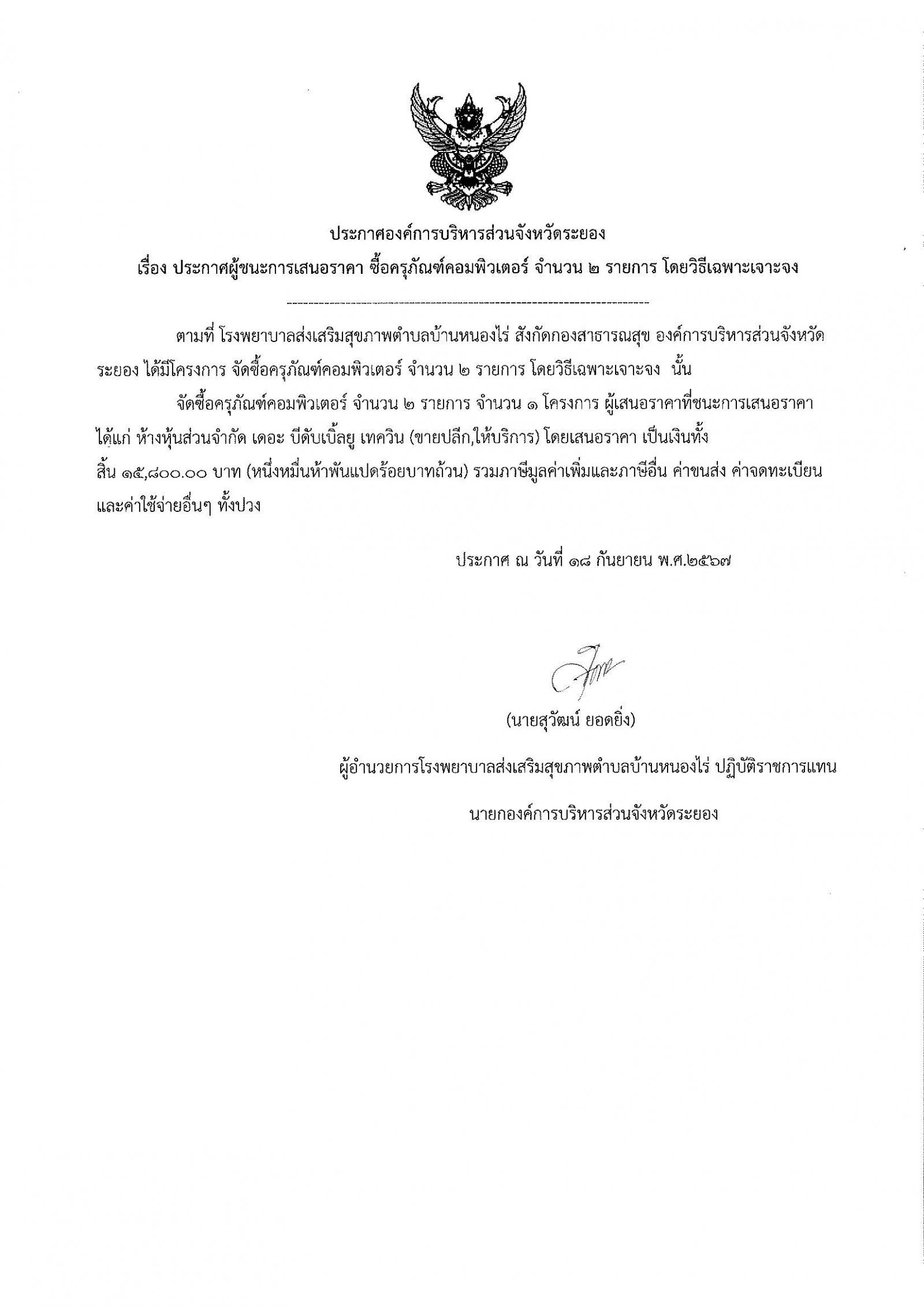 ประกาศผู้ชนะการเสนอราคา ซื้อครุภัณฑ์คอมพิวเตอร์ จำนวน 2 รายการ โดยวิธีเฉพาะเจาะจง