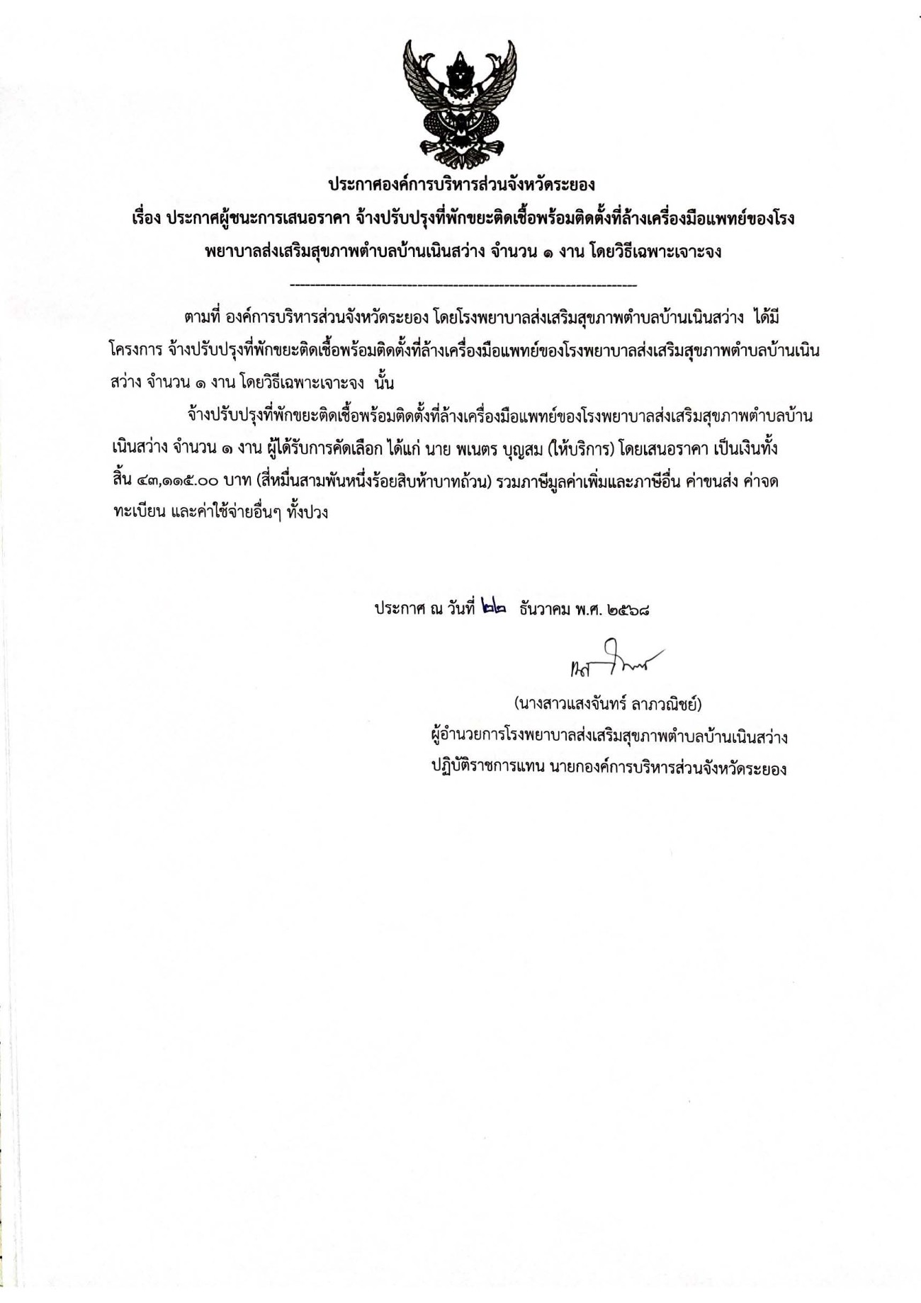 ประกาศผู้ชนะการเสนอราคา จ้างปรับปรุงที่พักขยะติดเชื้อพร้อมติดตั้งที่ล้างเครื่องมือแพทย์ของ รพ.สต. บ้านเนินสว่าง จำนวน 1 งาน โดยวิธีเฉพาะเจาะจง
