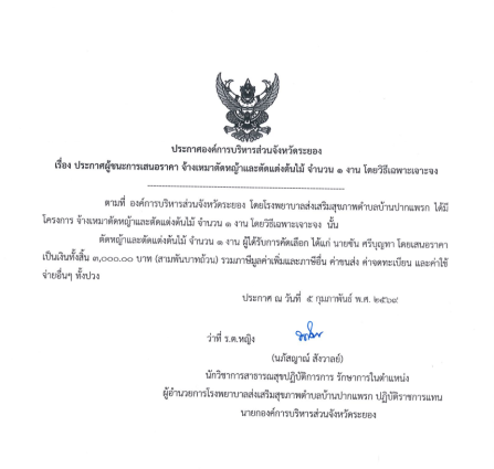 ประกาศผู้ชนะการเสนอราคา จ้างเหมาตัดหญ้าและตัดแต่งต้นไม้ จำนวน 1 งาน โดยวิธีเฉพาะเจาะจง 23 มีนาคม 2569 2