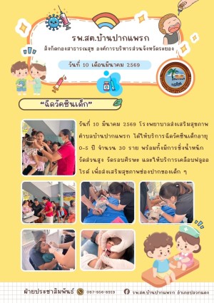 วันที่ 10 มีนาคม 2569 รพ.สต.บ้านปากแพรก ให้บริการฉีดวัคซีนเด็กอายุ 0-5 ปี พร้อมทั้งมีการชั่งน้ำหนัก วัดส่วนสูง วัดรอบศีรษะ และเคลือบฟลูออไรด์ 10 มีนาคม 2569 24