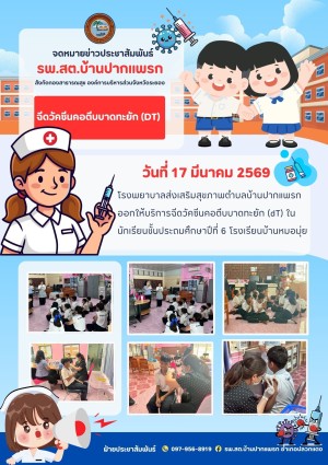วันที่ 12 มีนาคม 2569 รพ.สต.บ้านปากแพรก ออกให้บริการฉีดวัคซีนคอตีบบาดทะยัก (dt) ในนักเรียนชั้น ม.6 โรงเรียนบ้านปากแพรก 12 มีนาคม 2569 16