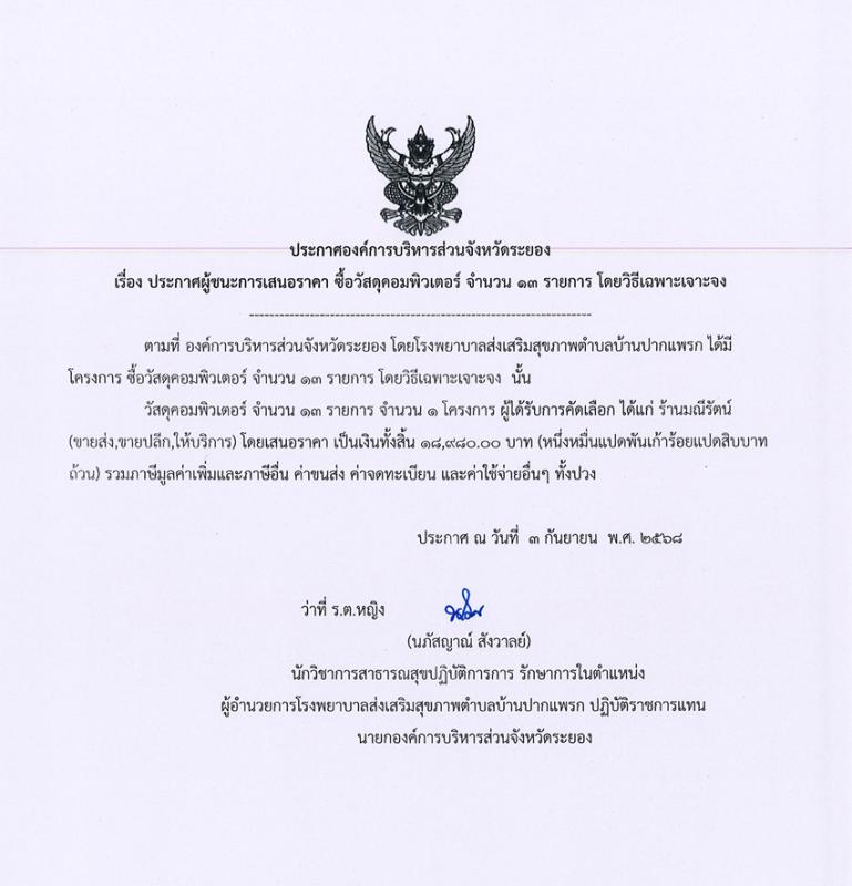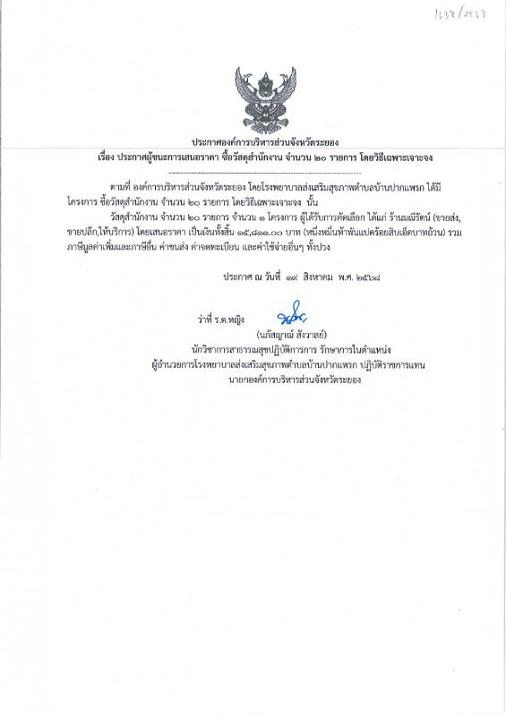 ประกาศผู้ชนะการเสนอราคา ซื้อวัสดุสำนักงาน จำนวน 20 รายการ โดยวิธีเฉพาะเจาะจง