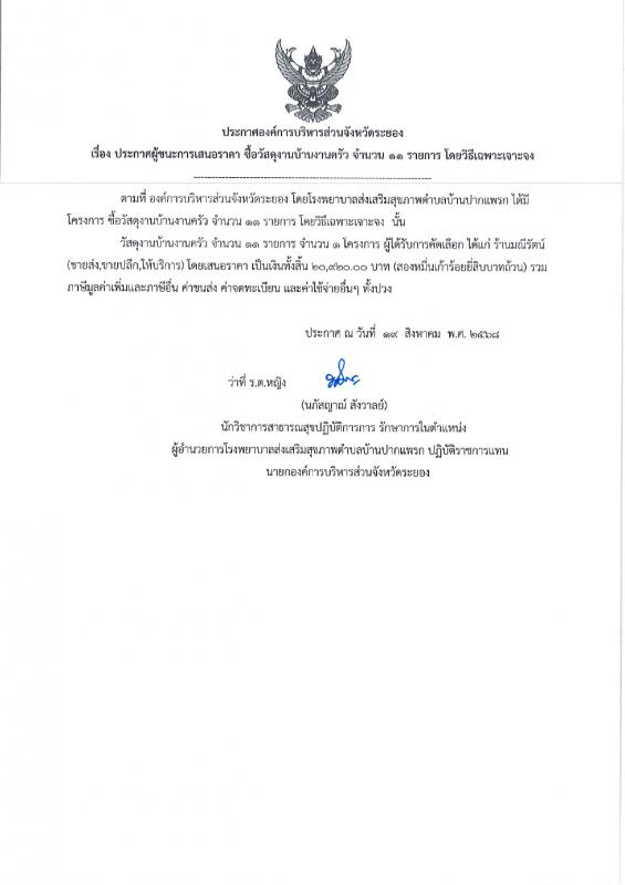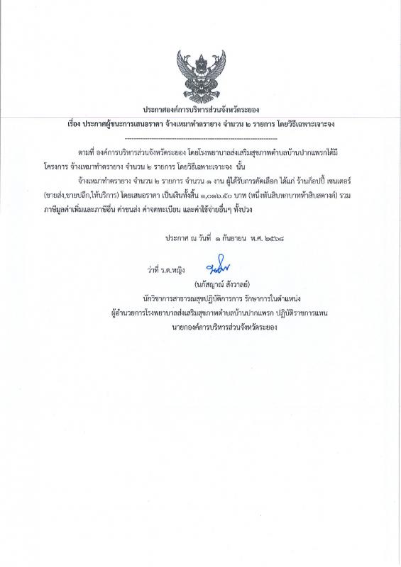 ประกาศผู้ชนะการเสนอราคา จ้างเหมาทำป้าย จำนวน 2 รายการ