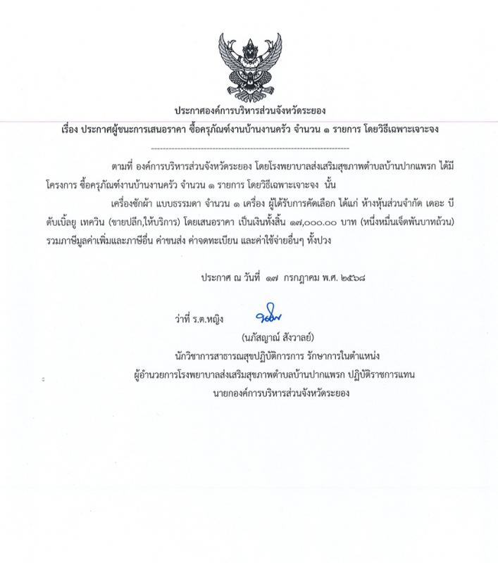 ประกาศผู้ชนะการเสนอราคา ครุภัณฑ์งานบ้านงานครัว จำนวน 1 รายการ