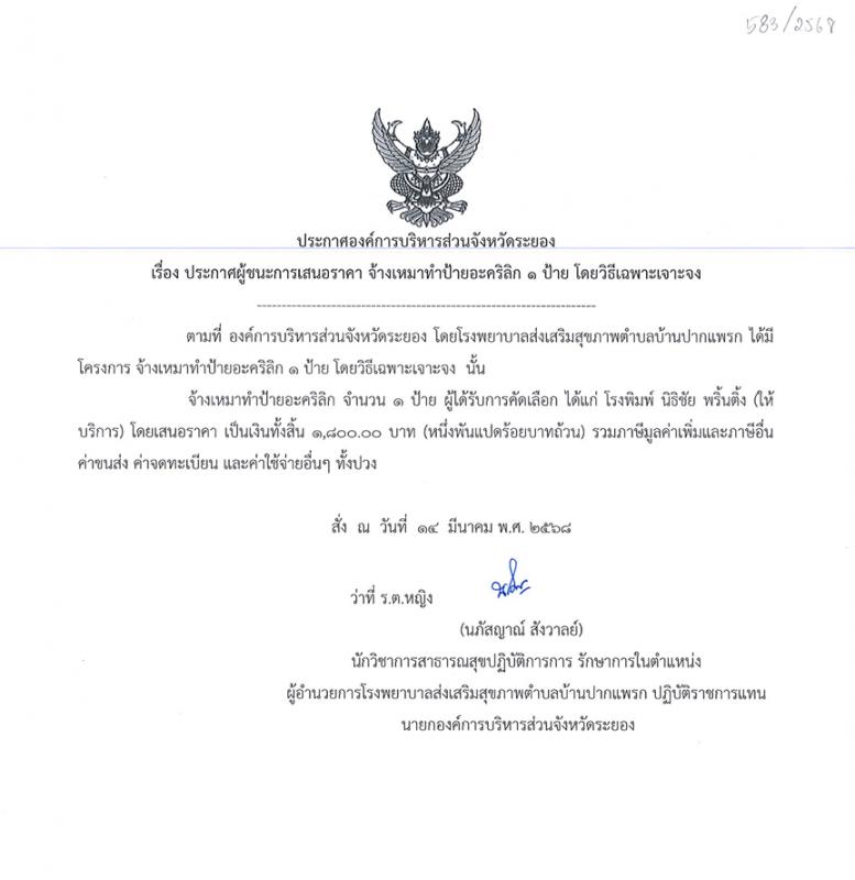 ประกาศผู้ชนะการเสนอราคา จ้างเหมาทำป้ายอะคริลิก 1 ป้าย โดยวิธีเฉพาะเจาะจง