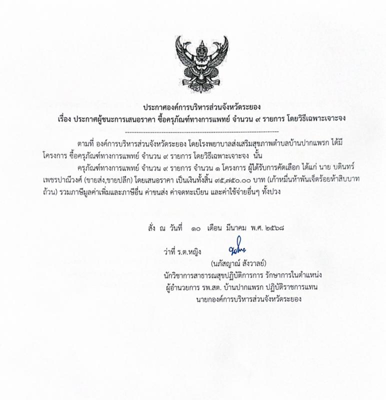 ประกาศผู้ชนะเสนอราคา ซื้อครุภัณทางการแพย์ จำนวน 9 รายการ โดยวิธีเฉพาะเจาะจง