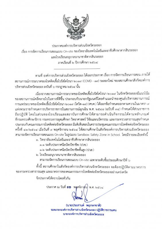การจัดการเรียนการสอนแบบ On site ของวิทยาลัยเทคโนโลยีและอาชีวศึกษาตากสินระยองและโรงเรียนอนุบาลนานาชาติตากสินระยองภาคเรียนที่ 2 ปีการศึกษา 2564 30 พฤศจิกายน 2564 777