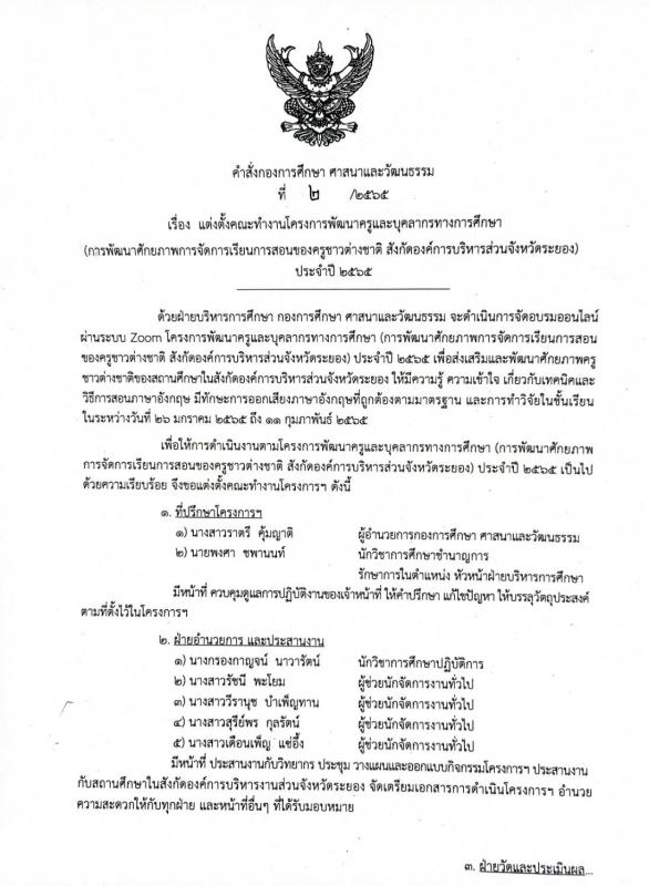 แจ้งประชาสัมพันธ์และคำสั่งกองการศึกษาฯ 2/2565 ด้วยฝ่ายบริหารการศึกษา จะดำเนินการจัดอบรมออนไลน์ผ่านระบบ Zoom โครงการพัฒนาครูและบุคลากรทางการศึกษา (การพัฒนาศักยภาพของครูชาวต่างชาติ สังกัดองค์การบริหารส่วนจังหวัดระยอง) ประจำปี 2565 21 มกราคม 2565 533