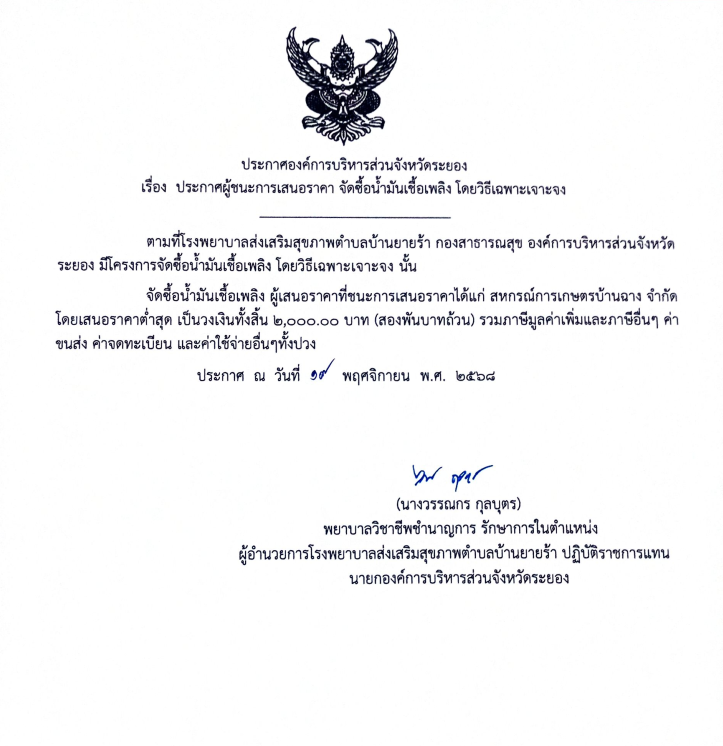 ประกาศผู้ชนะการเสนอราคา จัดซื้อน้ำมันเชื้อเพลิง โดยวิธีเฉพาะเจาะจง
