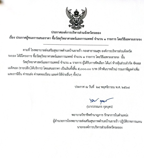 ประกาศผู้ชนะการเสนอราคา ซื้อวัสดุวิทยาศาสตร์และการแพทย์ โดยวิธีเฉพาะเจาะจง