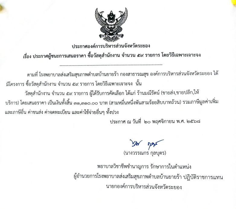 ประกาศผู้ชนะการเสนอราคา ซื้อวัสดุสำนักงาน จำนวน 59 รายการ โดยวิธีเฉพาะเจาะจง