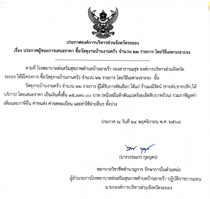 ประกาศผู้ชนะการเสนอราคา ซื้อวัสดุงานบ้านงานครัว โดยวิธีเฉพาะเจาะจง