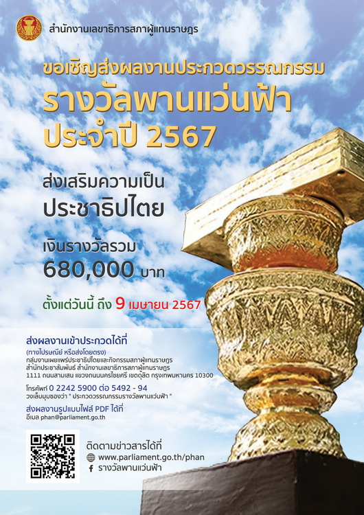 ขอเชิญส่งผลงานประกวดวรรณกรรมรางวัลพานแว่นฟ้า ประจำปี ๒๕๖๗
