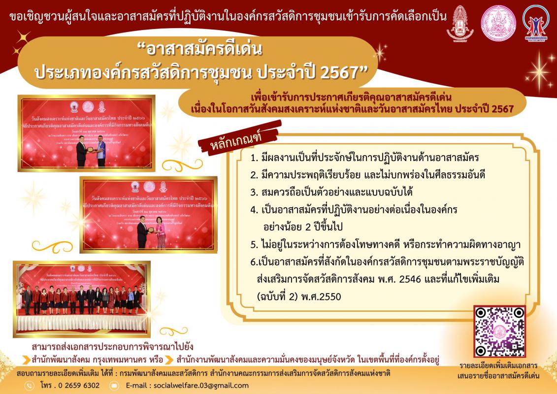 ขอความร่วมมือประชาสัมพันธ์การคัดเลือกอาสาสมัครดีเด่นประเภทองค์กรสวัสดิการชุมชน ประจำปี ๒๕๖๗