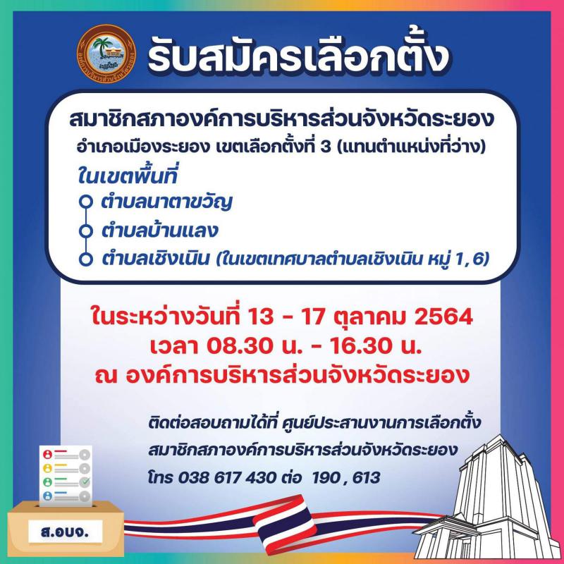 รับสมัครเลือกตั้ง สมาชิกสภาองค์การบริหารส่วนจังหวัดระยอง เขตอำเภอเมืองระยอง เขตเลือกตั้งที่ ๓ (แทนตำแหน่งที่ว่าง)