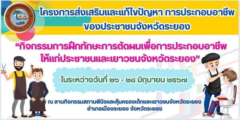 ขอเชิญเข้าร่วมโครงการกิจกรรมการฝึกทักษะการตัดผมเพื่อประกอบอาชีพให้แก่ประชาชนและเยาวชนจังหวัดระยองระหว่างวันที่ 26- 28 มิถุนายน 2567