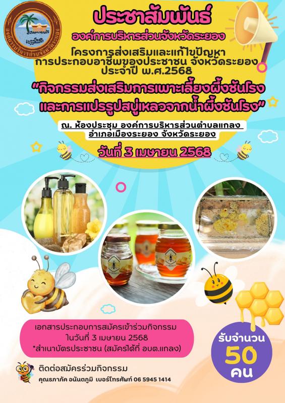โครงการส่งเสริมและแก้ไขปัญหาการประกอบอาชีพของประชาชนจังหวัดระยอง ประจำปีงบประมาณ พ.ศ. 2568 “กิจกรรมส่งเสริมการเพาะเลี้ยงผึ้งชันโรงและการแปรรูปสบู่เหลวจากน้ำผึ้งชันโรง”
