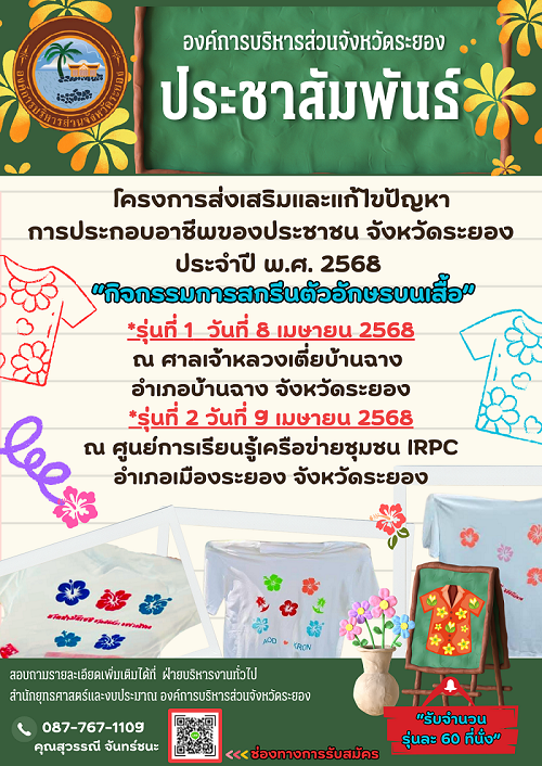 โครงการส่งเสริมและแก้ไขปัญหาการประกอบอาชีพของประชาชนจังหวัดระยอง ประจำปีงบประมาณ พ.ศ. 2568 “กิจกรรมการสกรีนตัวอักษรบนเสื้อ”
