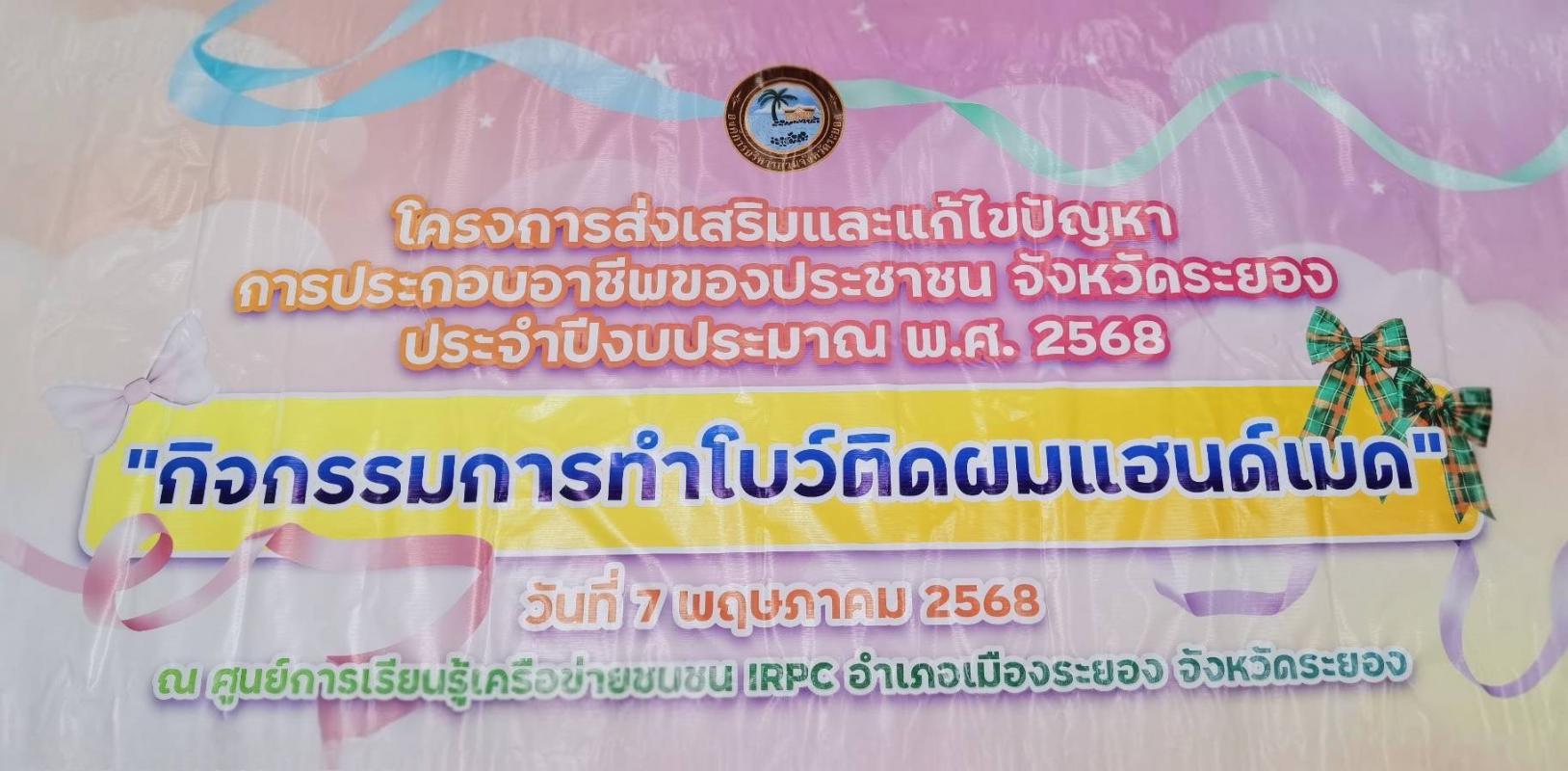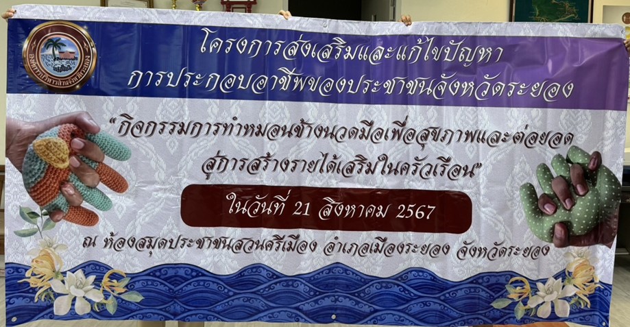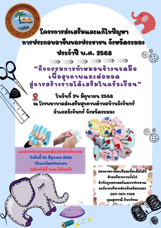 โครงการส่งเสริมและแก้ไขปัญหาการประกอบอาชีพของประชาชน จังหวัดระยอง ประจำปี พ.ศ.2568 "กิจกรรมการทำหมอนช้างนวดมือ เพื่อสุขภาพและต่อยอดสู่การสร้างรายได้เสริมในครัวเรือน"