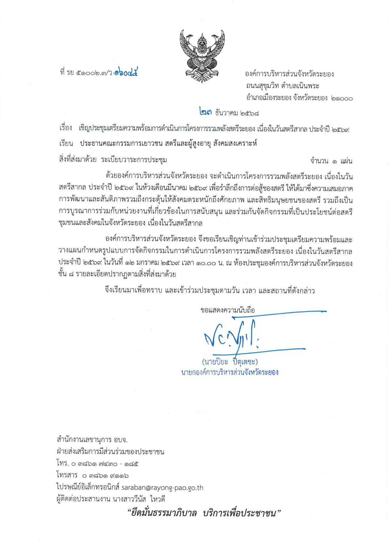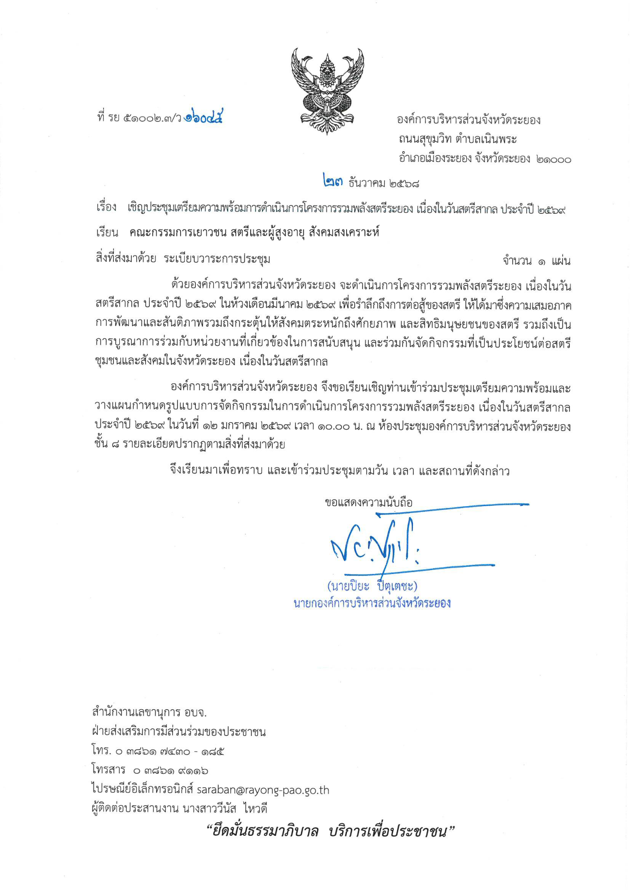 เชิญประชุมเตรียมความพร้อมการดำเนินการโครงการรวมพลังสตรีระยอง เนื่องในวันสตรีสากล ประจำปี 2569