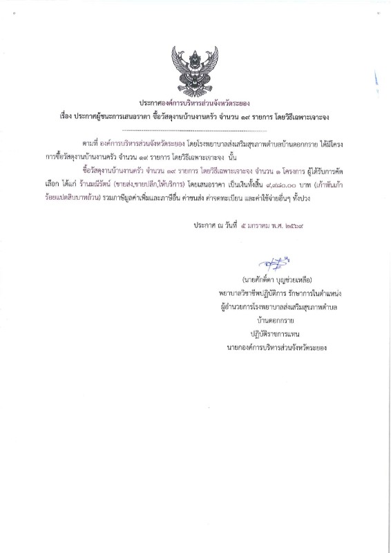 ประกาศผู้ชนะการเสนอราคา ซื้ัอวัสดุงานบ้านงานครัว จำ นวน 19 รายการ โดยวิธีเฉพาะเจาะจง