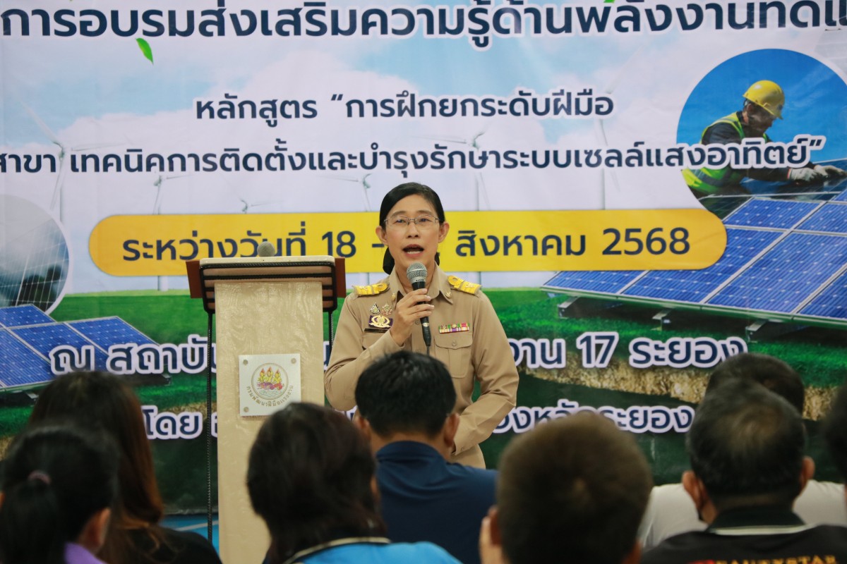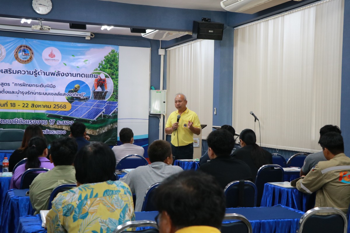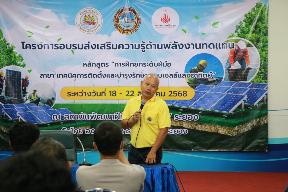 วันที่ 18 สิงหาคม 2568 เวลา 08.30 น. กองทรัพยากรธรรมชาติและสิ่งแวดล้อม โดย นางณิชาพร คุ้มท้วม ผู้อำนวยการกองทรัพยากรธรรมชาติและสิ่งแวดล้อม จัดโครงการอบรมส่งเสริมความรู้ด้านพลังงานทดแทน หลักสูตร "การฝึกยกระดับฝีมือ สาขา เทคนิคการติดตั้งและบำรุงรักษาระบบเซลล์แสงอาทิตย์" โดยมีนายประสานต์ พฤกษาชาติ รองนายกองค์การบริหารส่วนจังหวัดระยอง เป็นประธานในการเปิดโครงการ นายวีรวิชญ์ ภมรสมิต พลังงานจังหวัดระยอง เป็นผู้กล่าวรายงาน และนางสาวจิตชญา อ่ำสาลิกา ผู้อำนวยการสถาบันพัฒนาฝีมือแรงงาน 17 ระยอง กล่าวต้อนรับผู้เข้าร่วมอบรมในครั้งนี้ โครงการฯ มีวัตถุประสงค์เพื่อผลักดันการใช้พลังงานทดแทนในระดับครัวเรือน และชุมชน เพื่อช่วยลดค่าใช้จ่ายด้านพลังงาน และเสริมสร้างศักยภาพของประชาชนในการนำองค์ความรู้ด้านพลังงาน ไปประยุกต์ใช้อย่างสร้างสรรค์ ทั้งในด้านการพัฒนาชุมชน การสร้างโอกาสในการประกอบอาชีพ และการเพิ่มรายได้ โดยมีระยะเวลาในการฝึกอบรมรวม 5 วัน ผู้เข้ารับการฝึกอบรมประกอบด้วย เจ้าหน้าที่รัฐ และประชาชนผู้สนใจในจังหวัดระยอง จำนวน 60 คน ณ สถาบันพัฒนาฝีมือแรงงาน 17 ระยอง