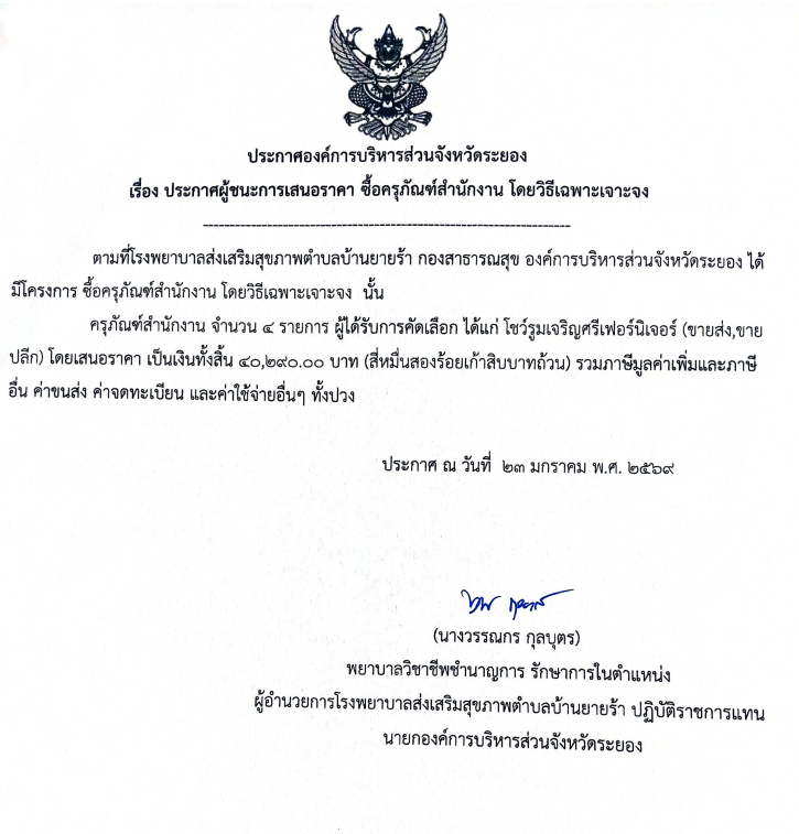 โรงพยาบาลส่งเสริมสุขภาพตำบลบ้านยายร้า > ข่าวประชาสัมพันธ์ ประกาศผู้ชนะการเสนอราคา ซื้อครุภัณฑ์สำนักงาน โดยวิธีเฉพาะเจาะจง