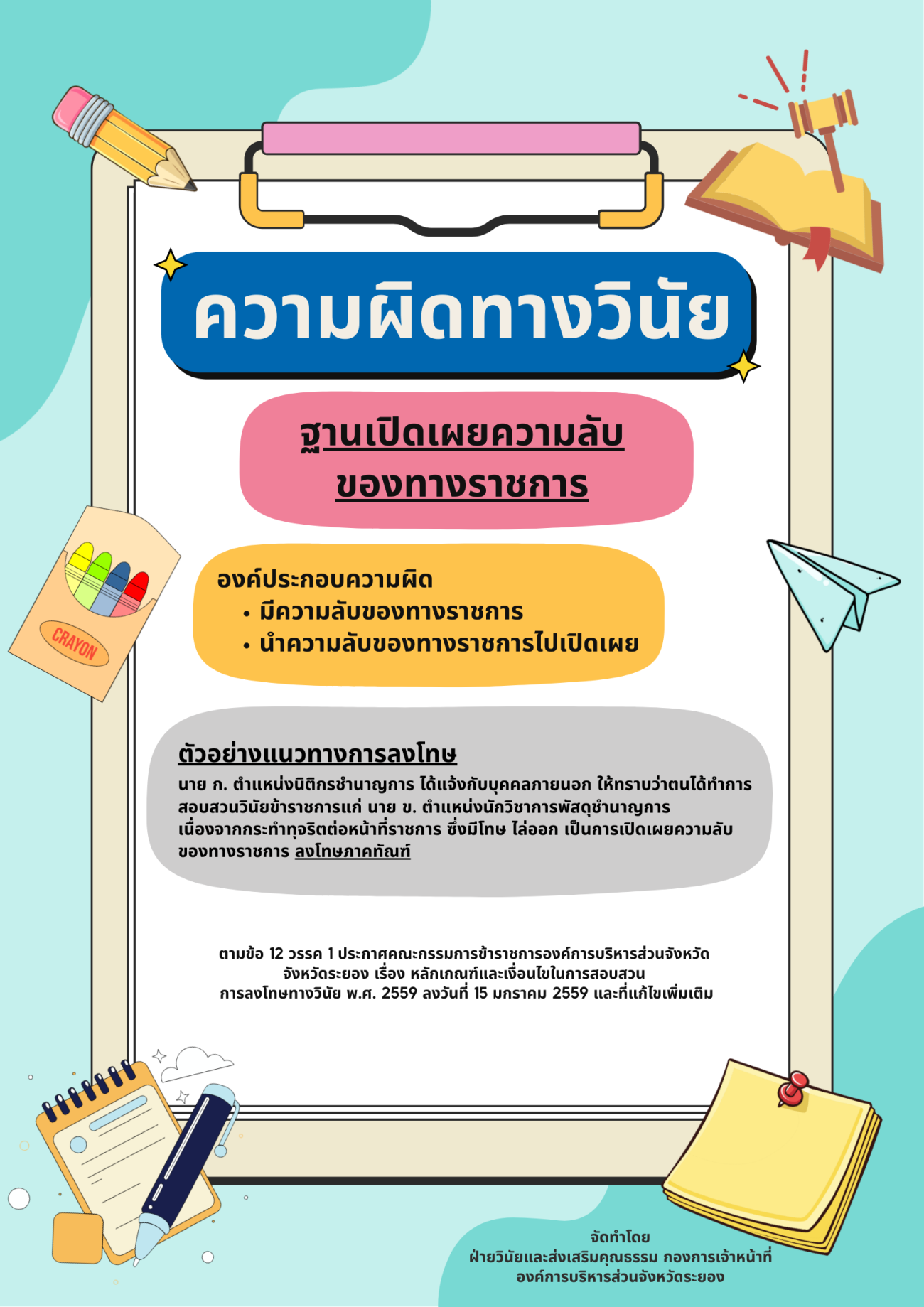 - การเผยแพร่เอกสารความรู้ด้านวินัยและเสริมสร้างคุณธรรม